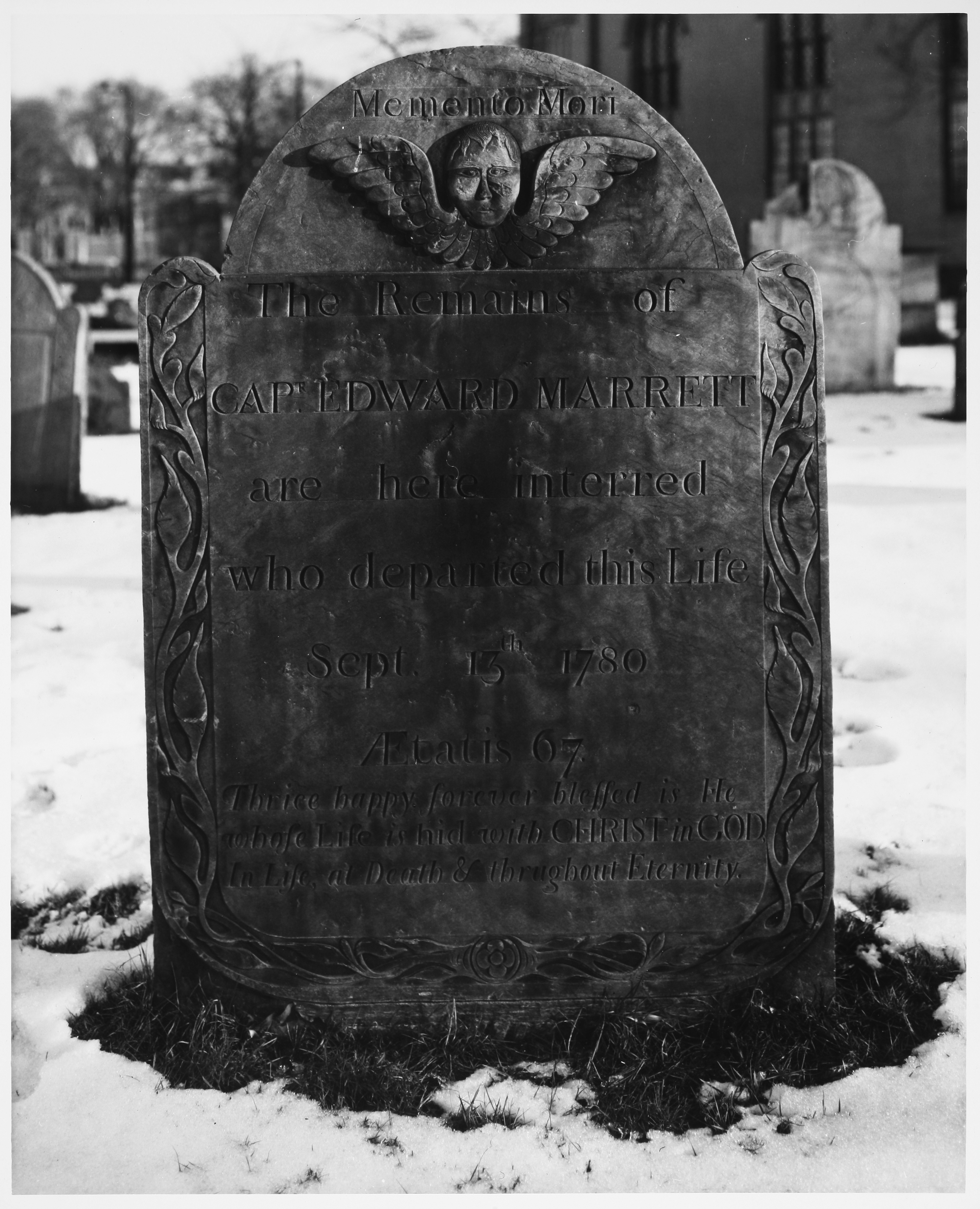 Cemeteries, Monuments, Tombstones, Boston (Mass.), Snow, City and town life, Bas-relief, Massachusetts Institute of Technology, Urban areas, Land use, Urban, City planning, Urban planning and environment, Documentary photography, Kepes/Lynch Photograph Collection, Monuments and Statues (Boston, Mass. and Surrounding Areas)