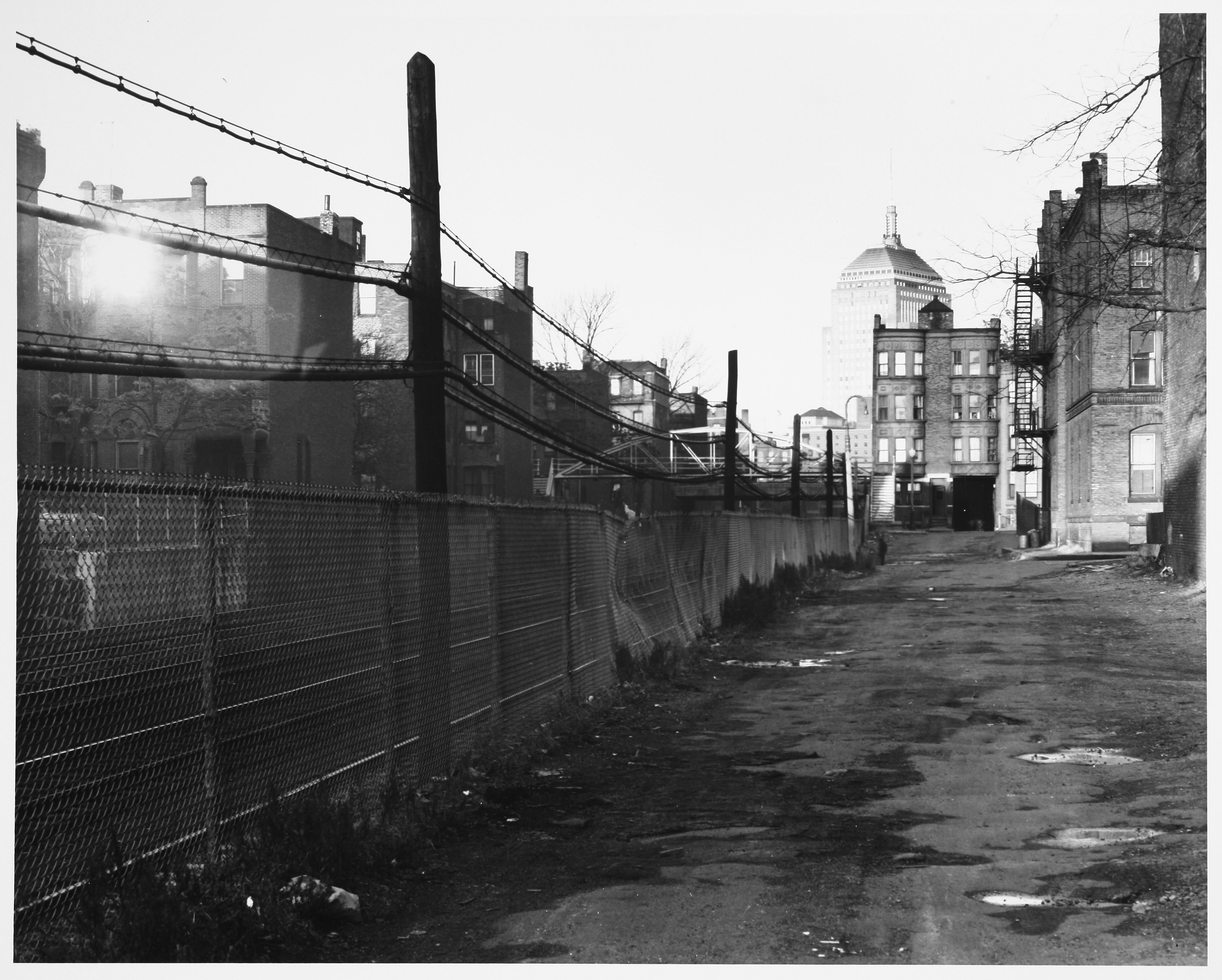 Apartment houses, Fences, Fire escapes, Windows, City and town life, Footbridges, Back Bay (Boston, Mass.), Massachusetts Institute of Technology, Urban areas, Land use, Urban, City planning, Residential architecture, Urban planning and environment, Documentary photography, John Hancock Building (Boston, MA), Kepes/Lynch Photograph Collection, Mixed use, Railroad tracks