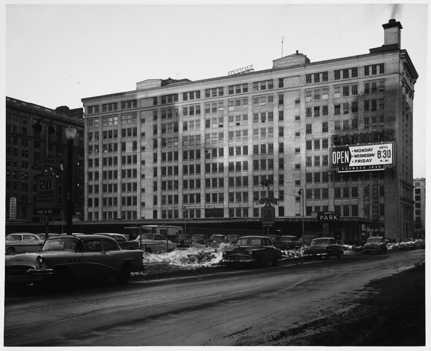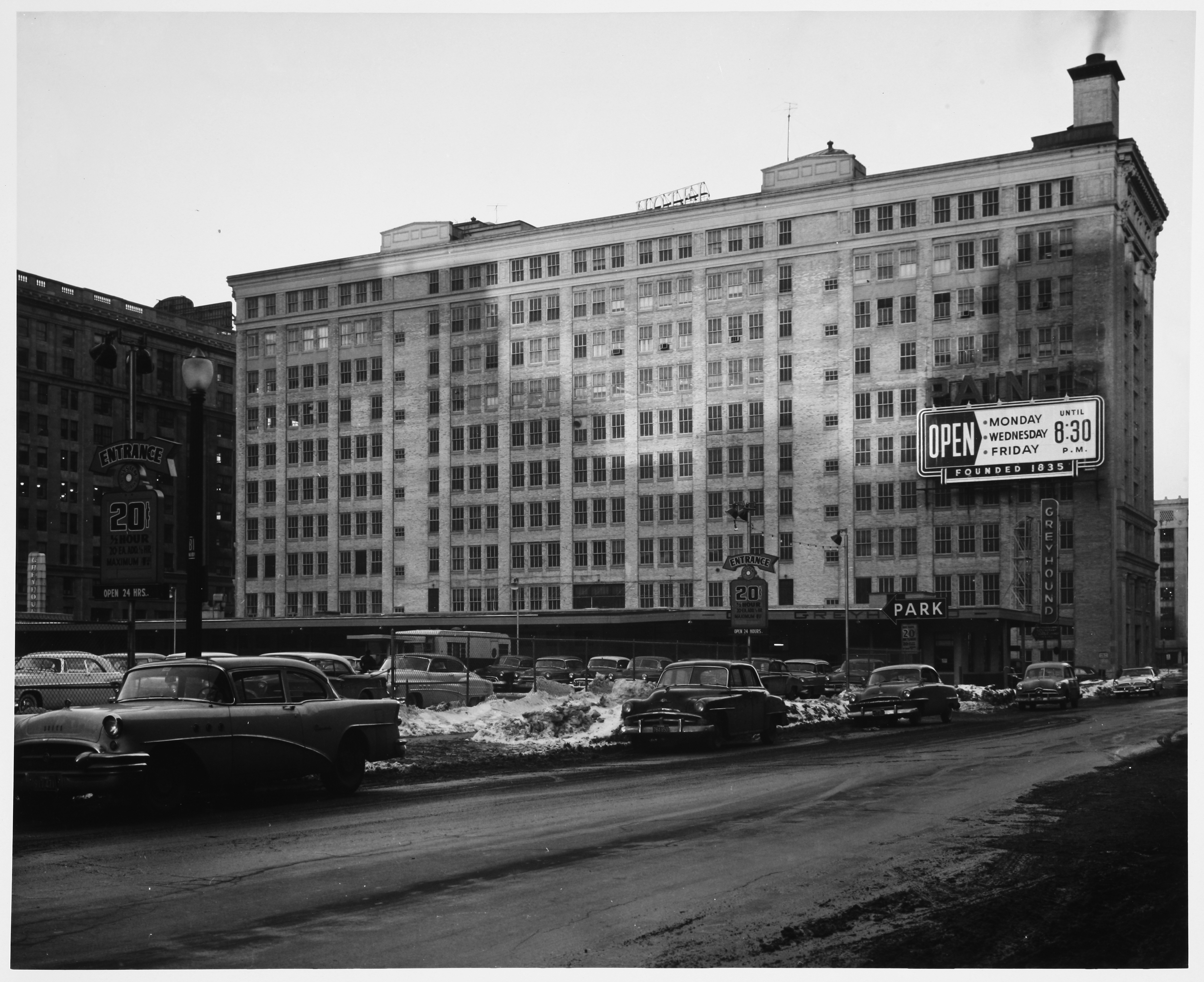 Automobiles, Hotels (Public accommodations), Shop signs, Boston (Mass.), Snow, City and town life, Parking lots, Back Bay (Boston, Mass.), Massachusetts Institute of Technology, Urban areas, Land use, Urban, City planning, Urban planning and environment, Documentary photography, Kepes/Lynch Photograph Collection, Street lighting units, Greyhound buses, Bus stations