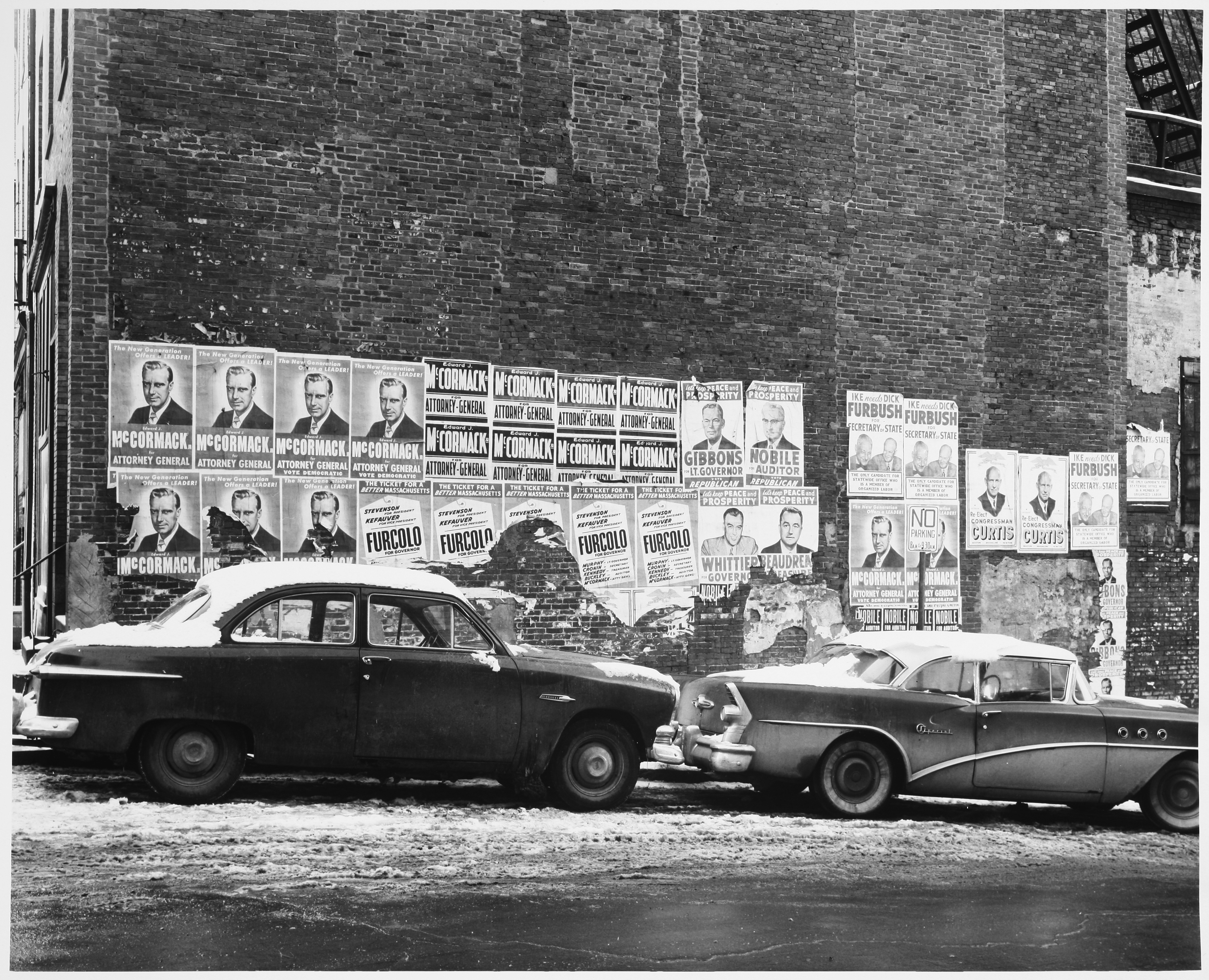 Automobiles, Politicians, Boston (Mass.), City and town life, Elections, Massachusetts Institute of Technology, Urban areas, Land use, Urban, City planning, Urban planning and environment, Documentary photography, Political posters, Kepes/Lynch Photograph Collection