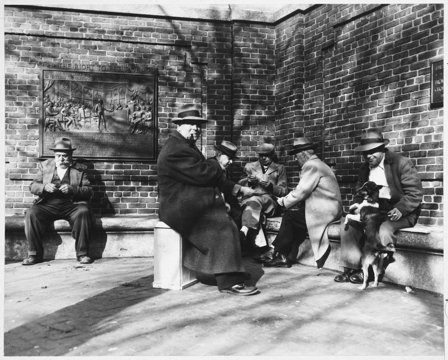 Playing cards, Dogs, Men, Boston (Mass.), City and town life, Fedoras, Massachusetts Institute of Technology, Urban areas, Land use, Urban, City planning, Urban planning and environment, Documentary photography, North End (Boston, Mass.), Paul Revere Mall, North End (Boston, MA), People in Contact with their Environment, Kepes/Lynch Photograph Collection, Pedestrian malls