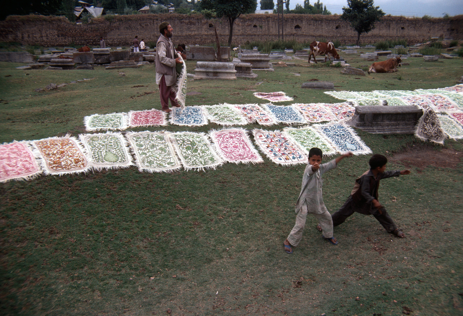 exterior, view of locally-made rugs (namdha) being dried, 1983