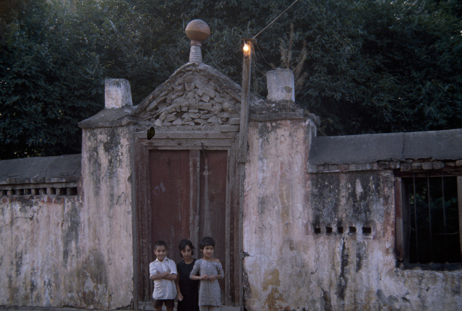 exterior, view of gate and compound wall to graveyard, 1983
