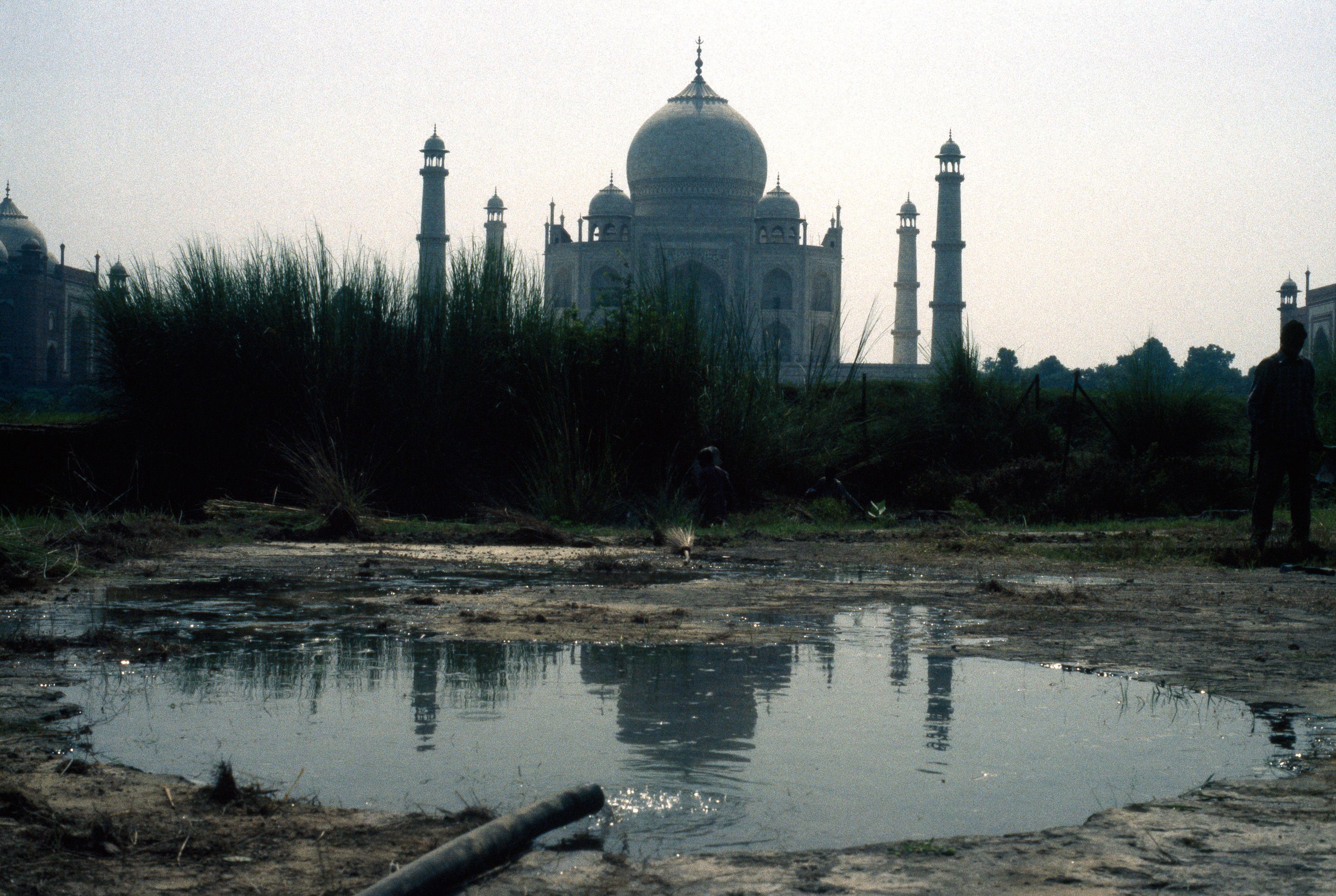 exterior, view of Taj Mahal from Mehtab Bagh, with partial reflection of Taj in garden pool
