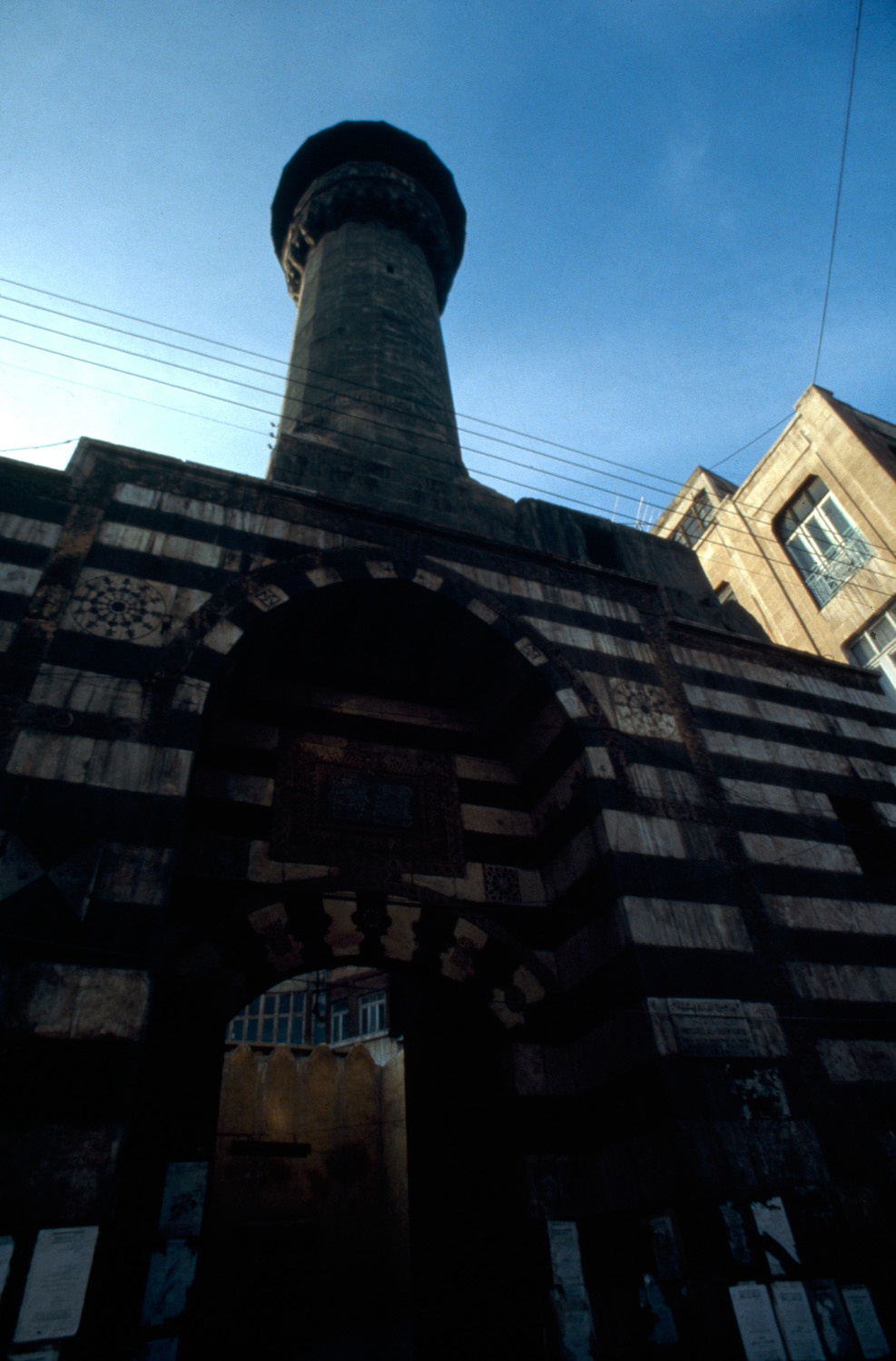 exterior, view looking upwards at minaret, 1982