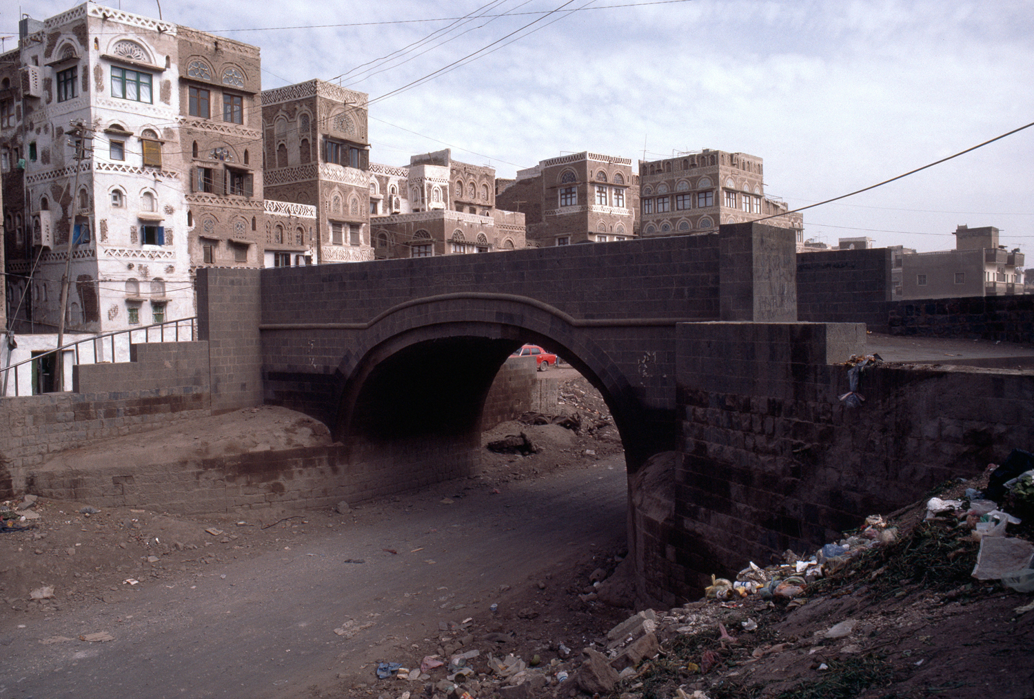 general view, old city, view of bridge over Wadi Sa’ilah (seasonal waterbed) from south, with tower houses in background, 1984