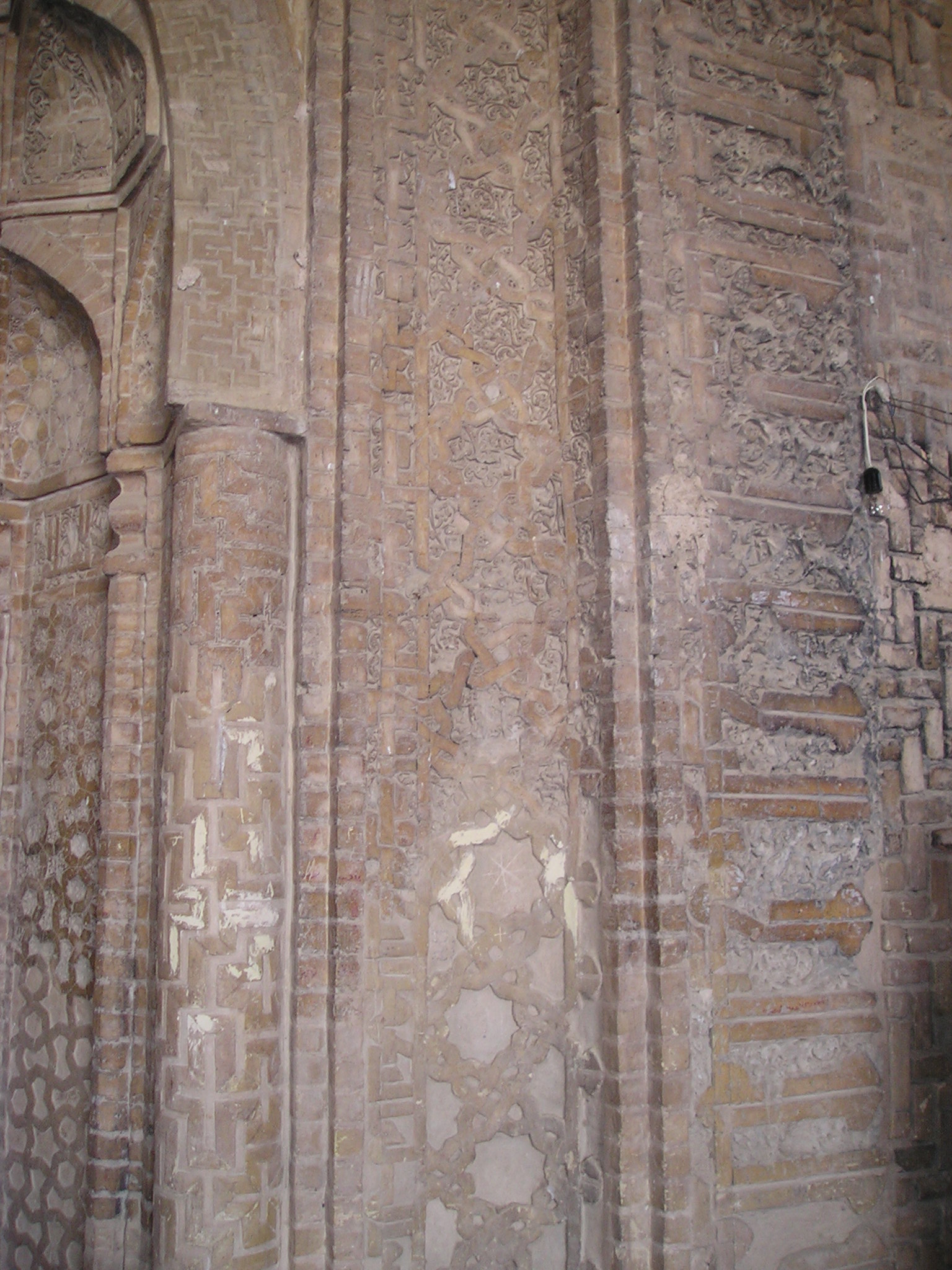 Single domed chamber with elaborate brick revetment inside and on minaret. Remnants of buildings around courtyard; entrance to domed prayer hall from courtyard is now blocked up. exterior, brickwork and stucco, 2003
