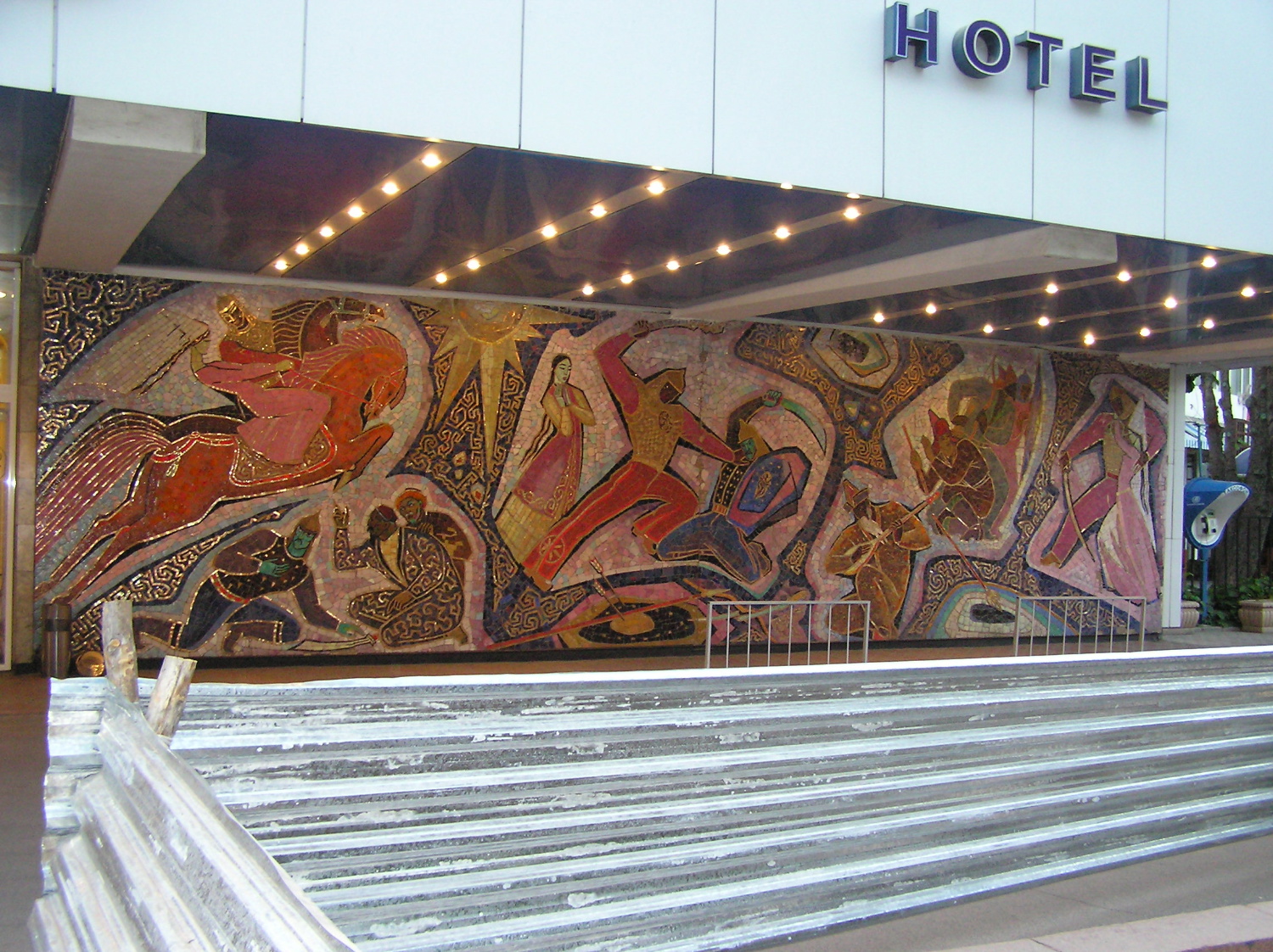 exterior, ca. 1980s tile mosaic on a hotel, 2009