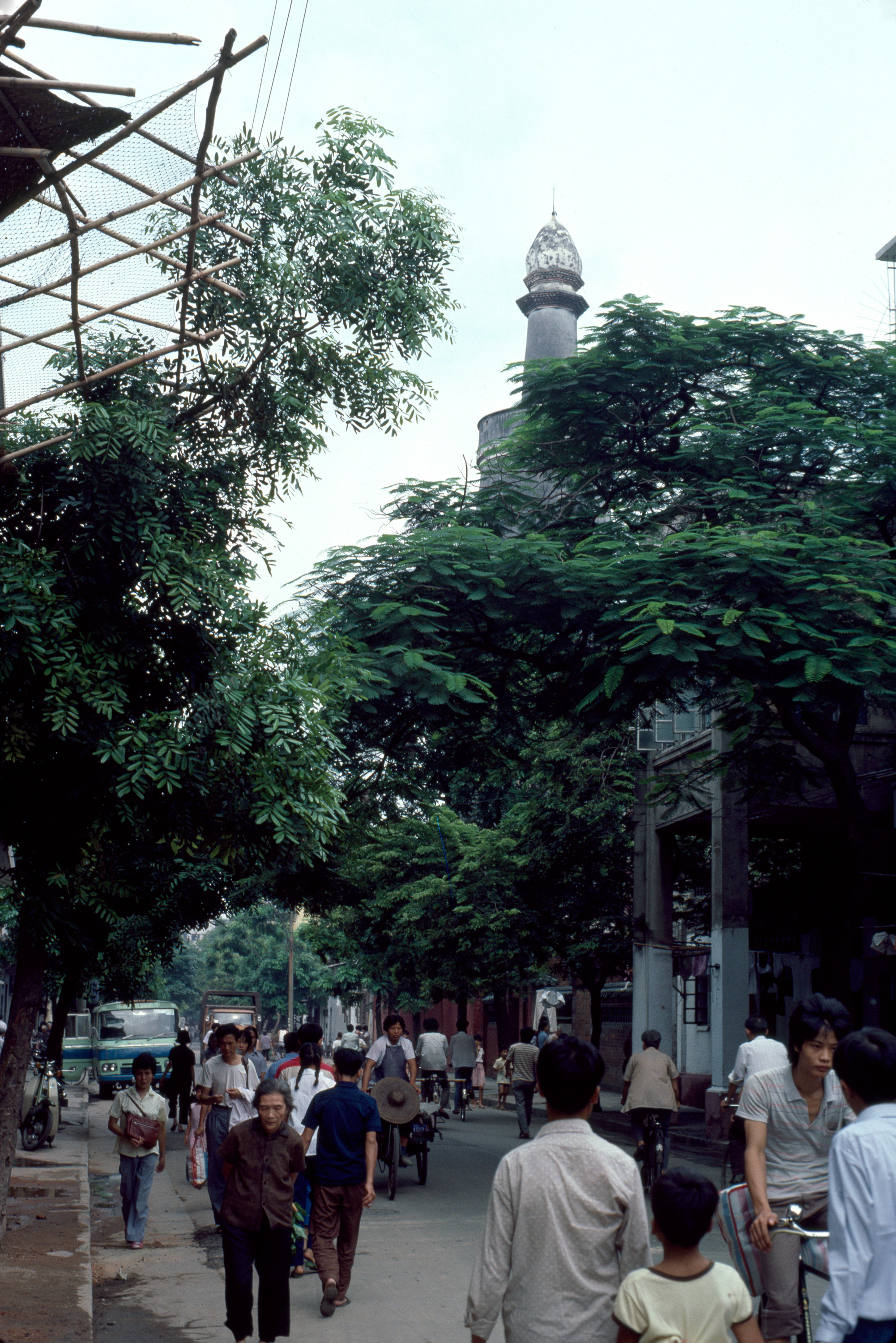 exterior, approach to mosque on Huai Sun Su Street, with minaret rising above the trees, 1984