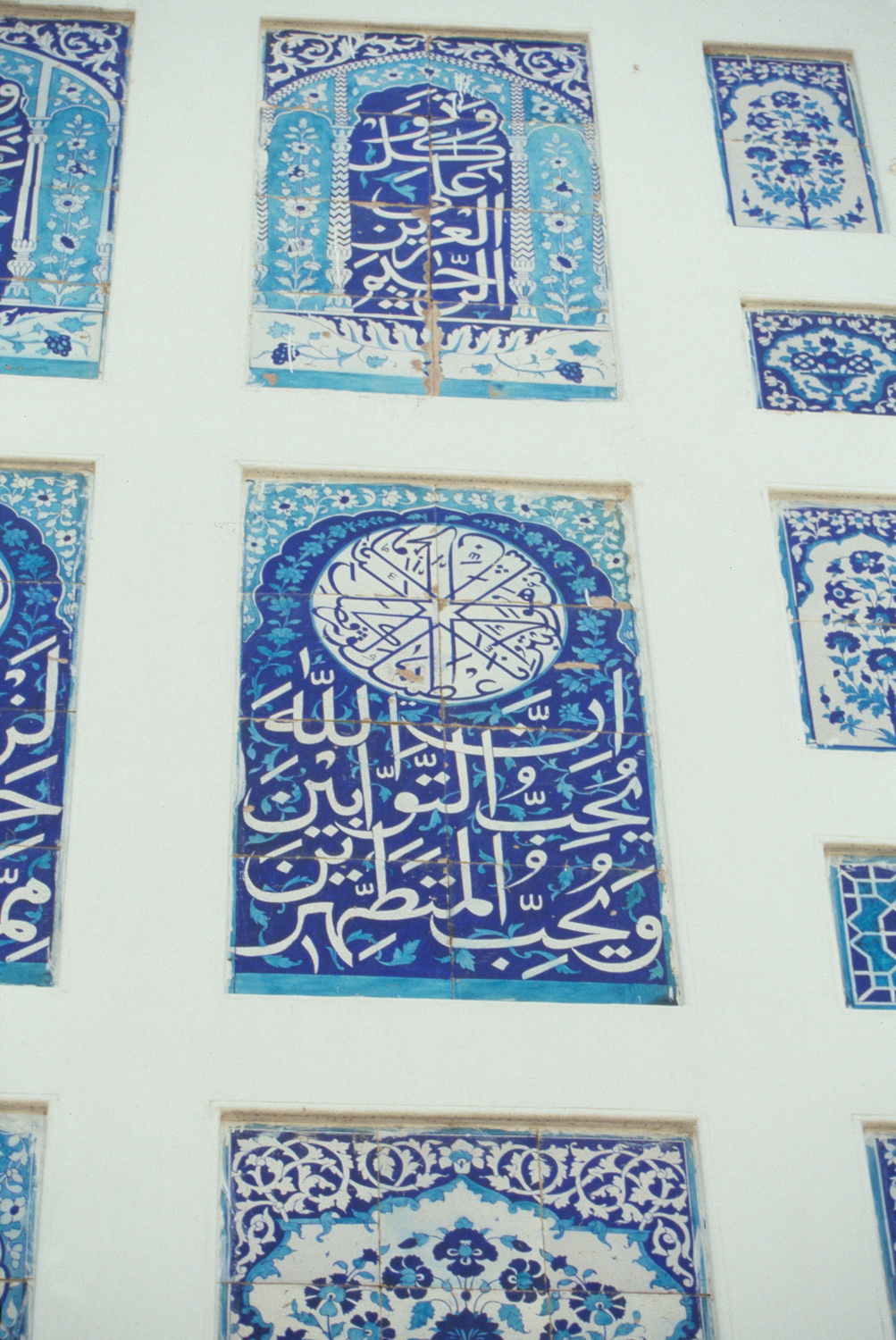 exterior, panels of calligraphic patterns composed of clay glazed tiles made locally in M, 1988