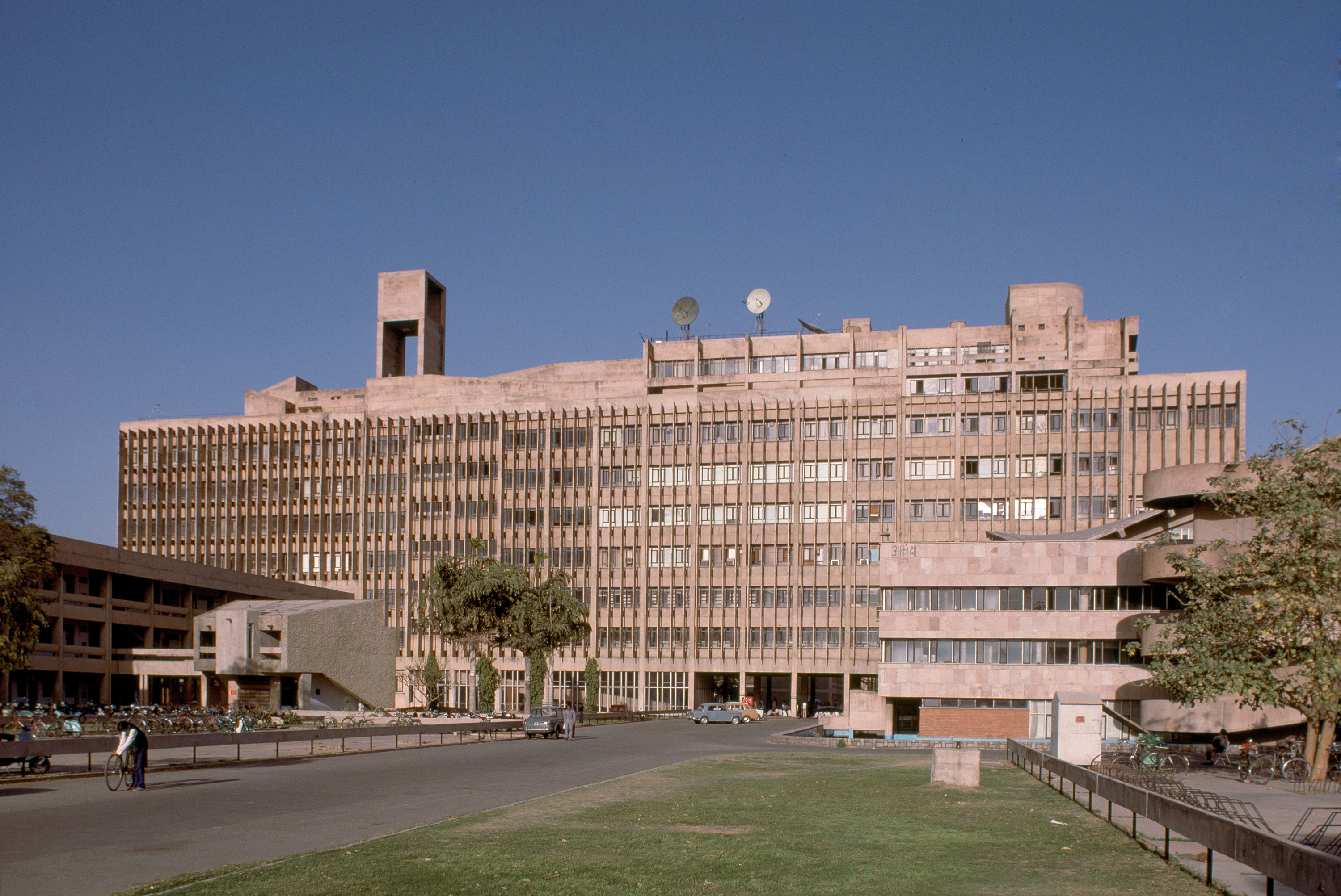 (from Peter Serenyi's papers)Hauz Khas, New Delhi 110016 exterior, seven-storied block housing science and humanities classrooms, 1985
