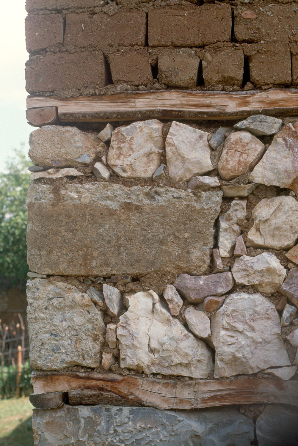 close-up view, view to north, corner of a wall of stone and mud brick layers, 1991