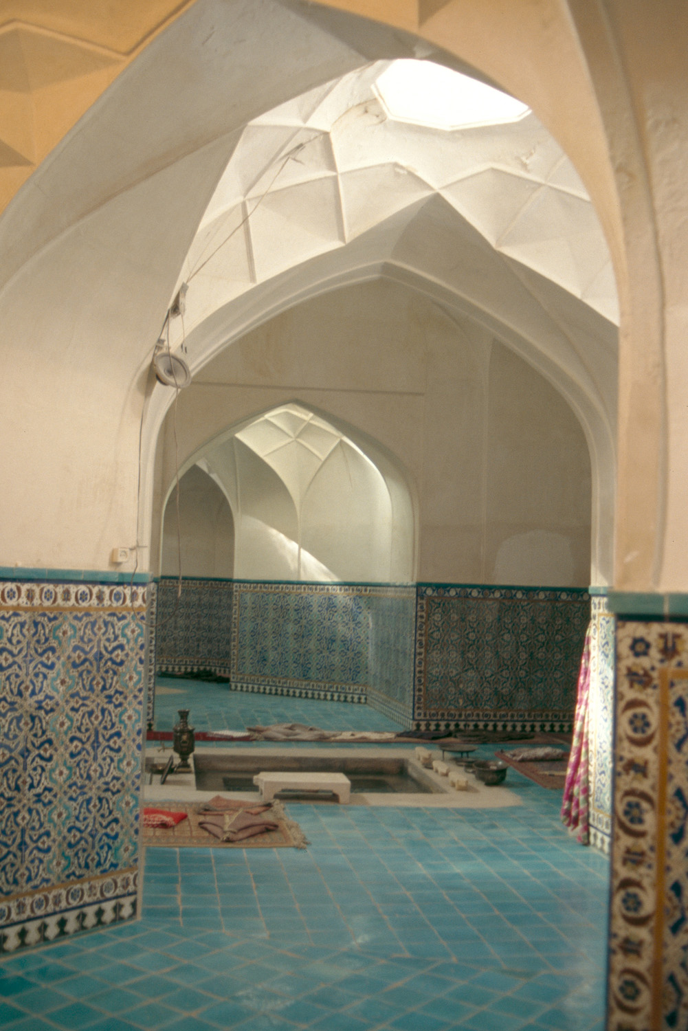 Bath is located on the square [maidan] of Ganj Ali Khan, reached through the bazaar. Arched entrance has figural tilework in the spandrels. Vaulted bath chambers are elaborately tiled with unique, mostly floral, designs not seen elsewhere in Iran.