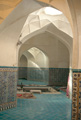 from "Kirman," : "while on the south there is an elaborate bath complex that incorporates earlier constructions and an octagonal cistern with dome chambers radiating from its sides. " [GDAO]Tilework in bath bears some resemblance to Iznik tiles, a connection which has not been explored yet by scholars. Susan Babaie of Univ. of Michigan is currently working on the Ganj Ali Khan complex. [E. Spettel] interior, view of the baths, hot room, 2001