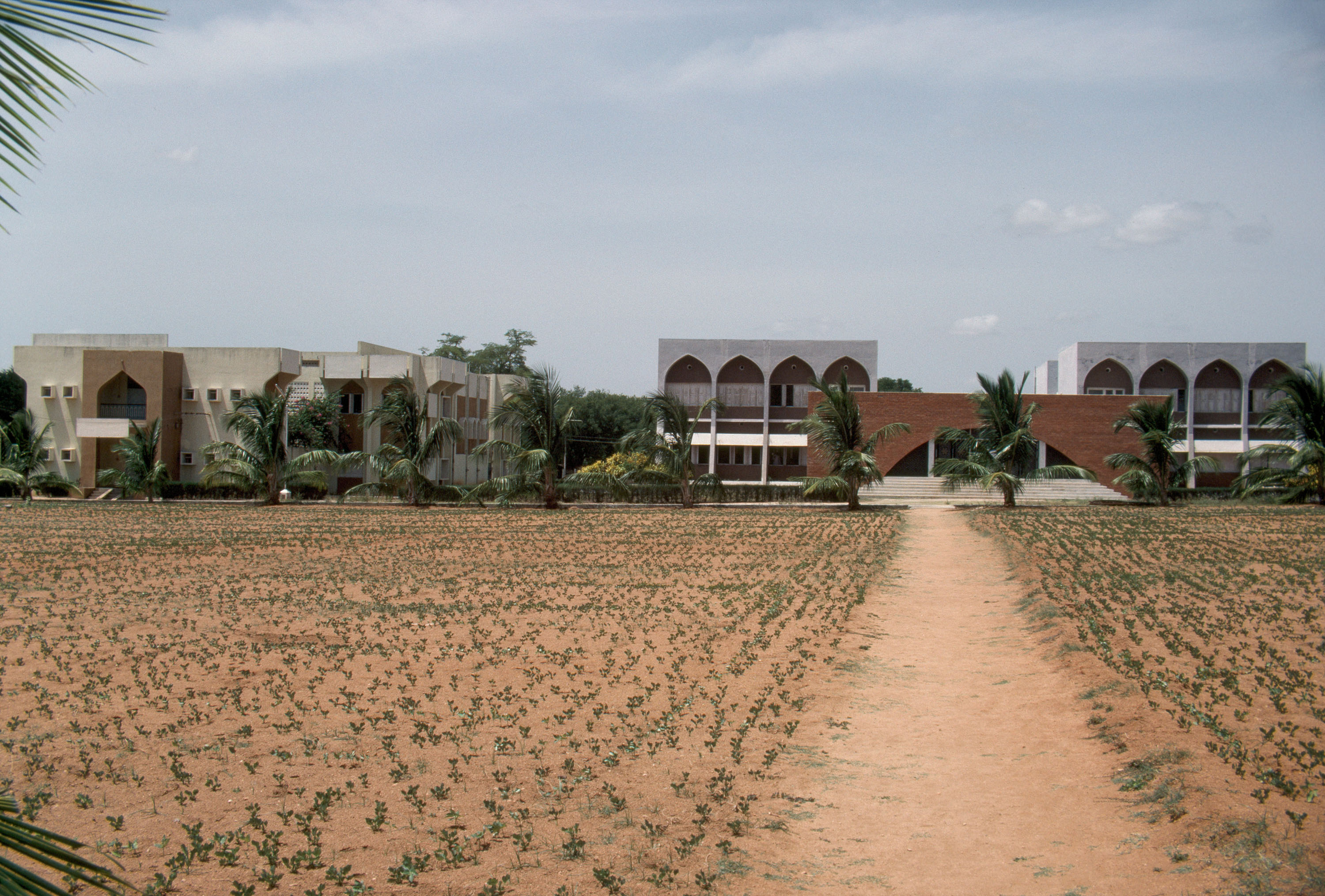 exterior, north (front) facade of Institute for Introductory Studies in Islam building, with main madrasa building on right, 1986