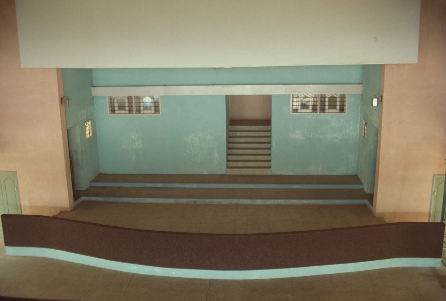 interior, mosque space in main madrasa building, detail of raised platform, 1986
