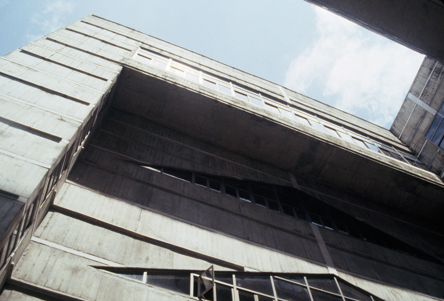 exterior, view looking up along facade, from exterior court, 1987