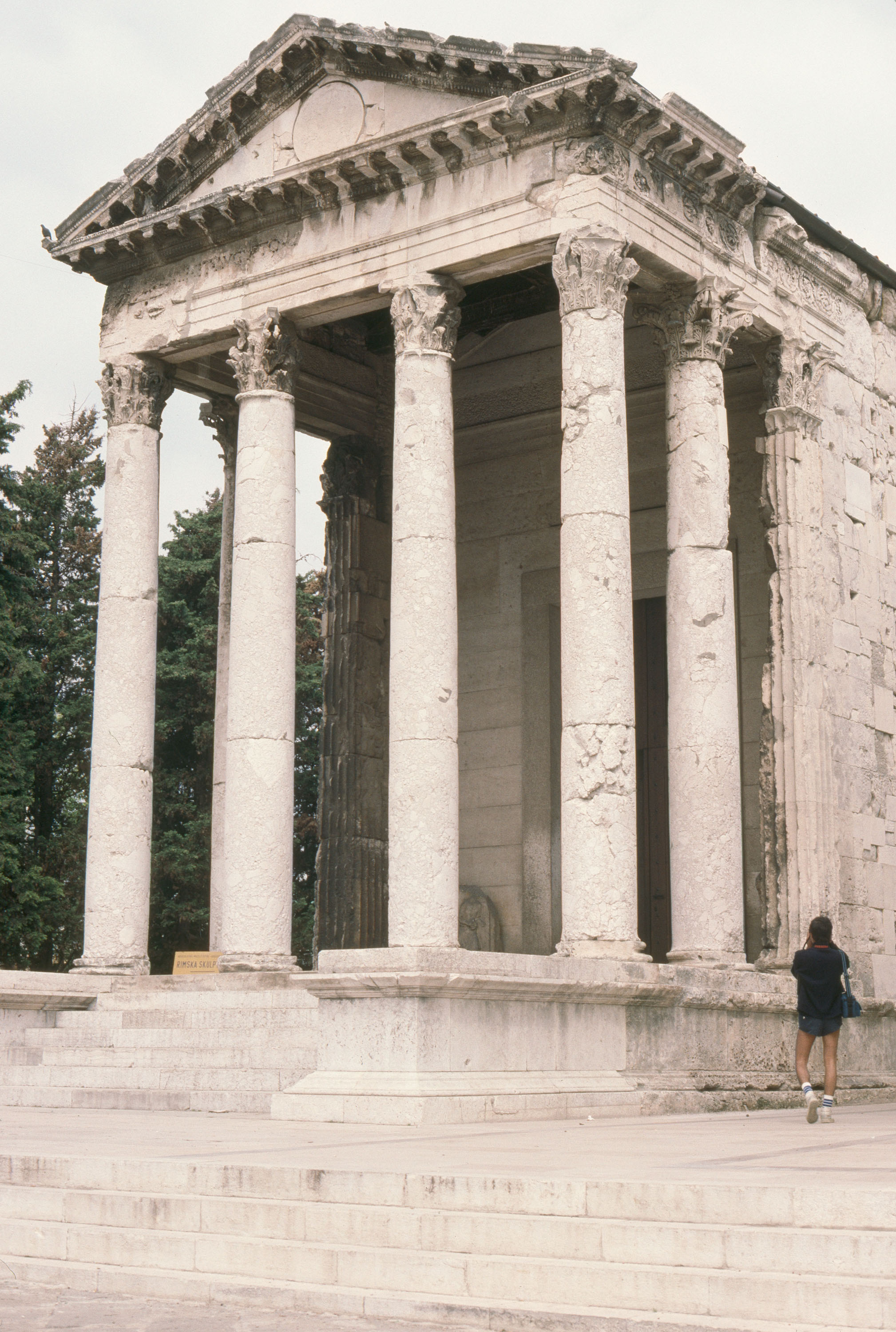 Friezes, Inscriptions, Stonework, Temples, Corinthian order, Porticoes, Architecture, Roman --Croatia, Architraves, Podiums (building divisions), Stairs, Plazas, Facades, Columns, Corinthian