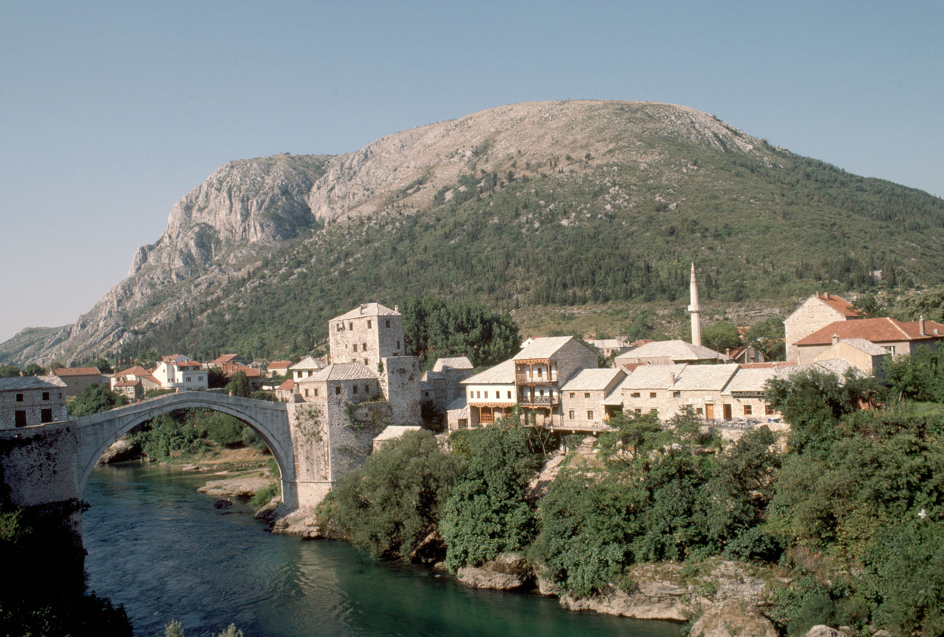 Arches, Stonework, Transportation, Buildings --War damage, Süleyman I, Sultan of the Turks, 1494 or 5-1566, Architecture, Islamic --Bosnia and Hercegovina, Architecture, Ottoman, Yugoslavia, Former Yugoslav republics, Bridges -- War damage, Neretva River (Bosnia and Hercegovina and Croatia), Cliffs, Rivers, Minarets, Watchtowers, Old towns, Arch bridges