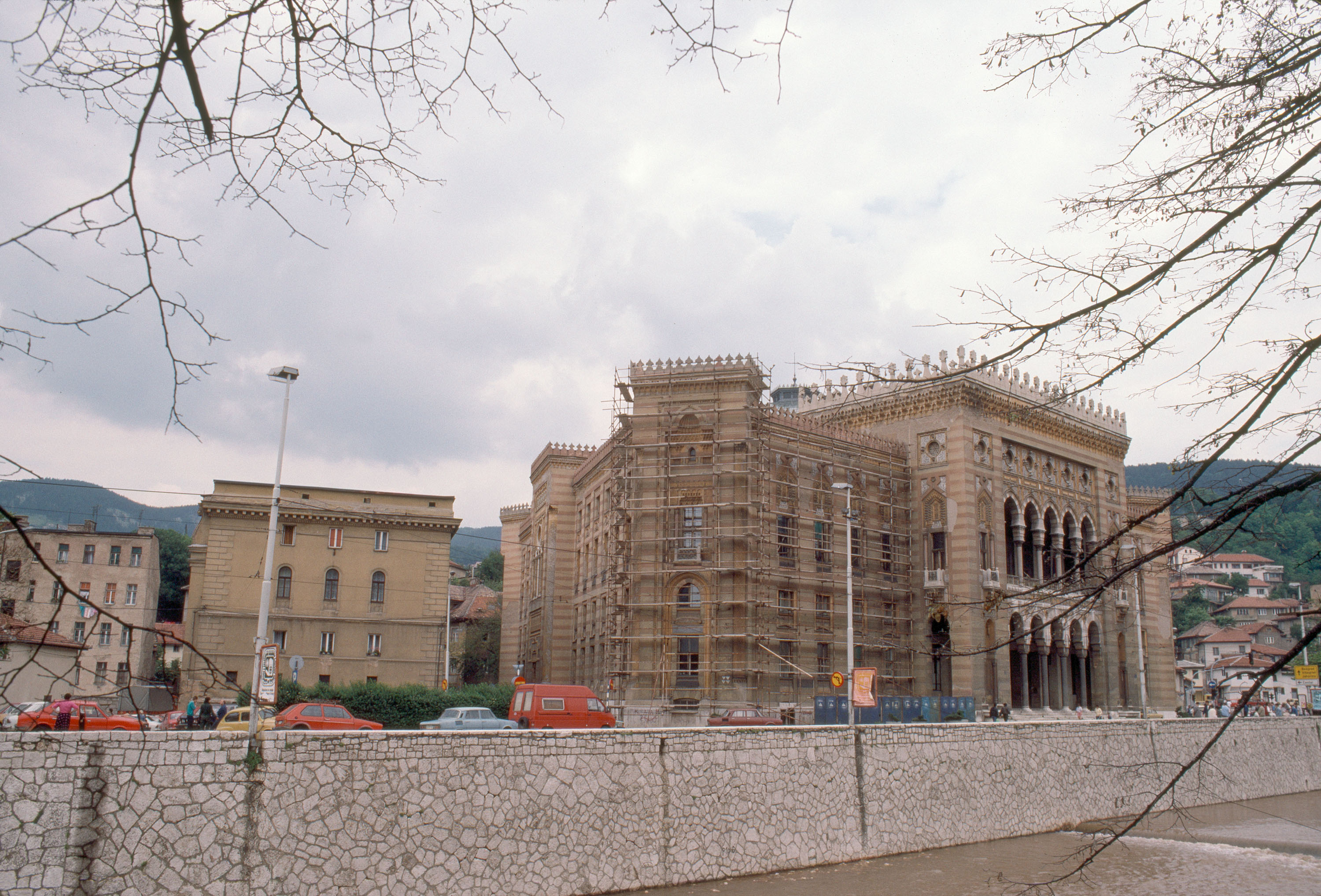 Polychromy, Stonework, City halls, Horseshoe arches, Buildings --War damage, National libraries, Triangular buildings, Adaptive reuse, Decoration and ornament, Architectural, Scaffolds, Facades, Cornices, Rehabilitating, Exterior