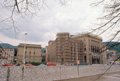 exterior, south and west facades seen from across the river and scaffolds on the near corner, 1989