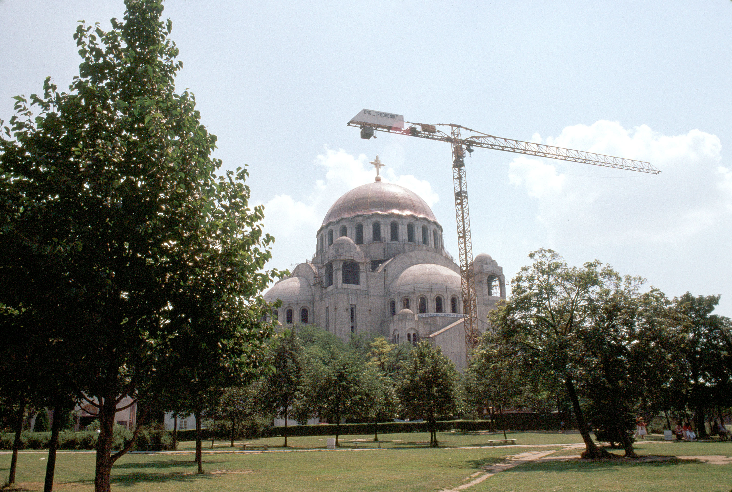 Cathedrals, Churches, Domes, Greek cross-plan, Religious buildings, Serbia --History, Sava, Saint, Copper, Stonework, Unfinished architecture, Clerestories, Semidomes, Unfinished, Cranes (equipment), Metal roofing