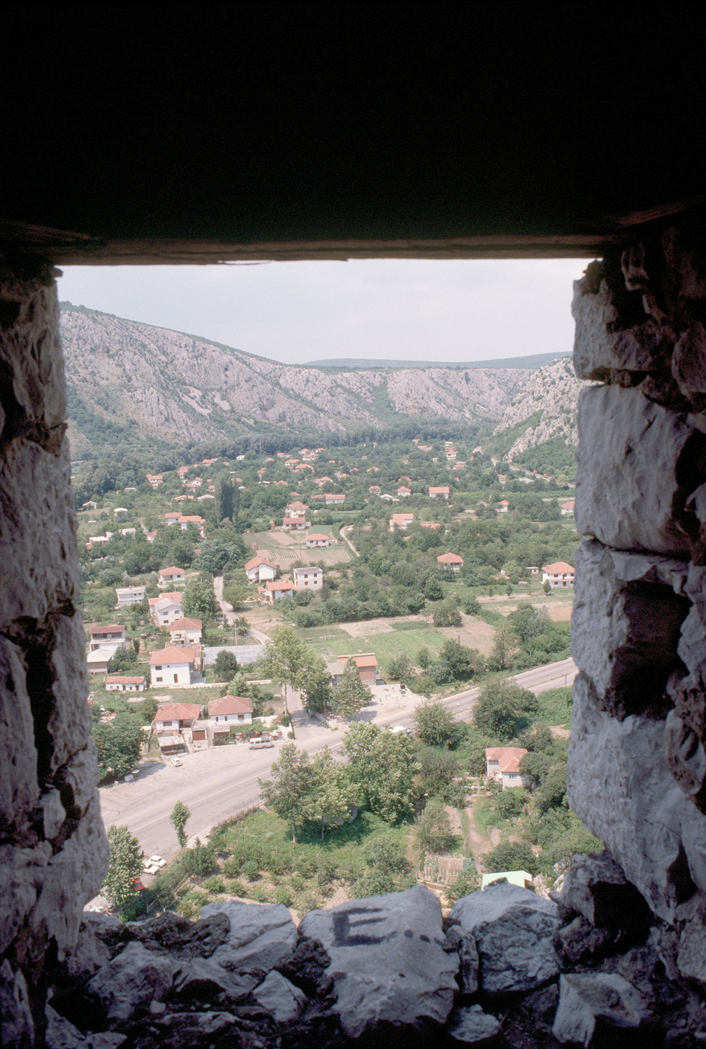 Towers (Building divisions), Fortresses, Villages, Buildings --War damage, Architecture, Islamic --Bosnia and Hercegovina, Architecture, Ottoman, Land use, Rural, Buildings, Octagonal, Defensive walls, Yugoslavia, Stone buildings, Former Yugoslav republics, Bosnia and Hercegovina, Roads, Windows, Roofing tile, Valleys (Landforms), Townscapes (built environment), Housing developments, Housing