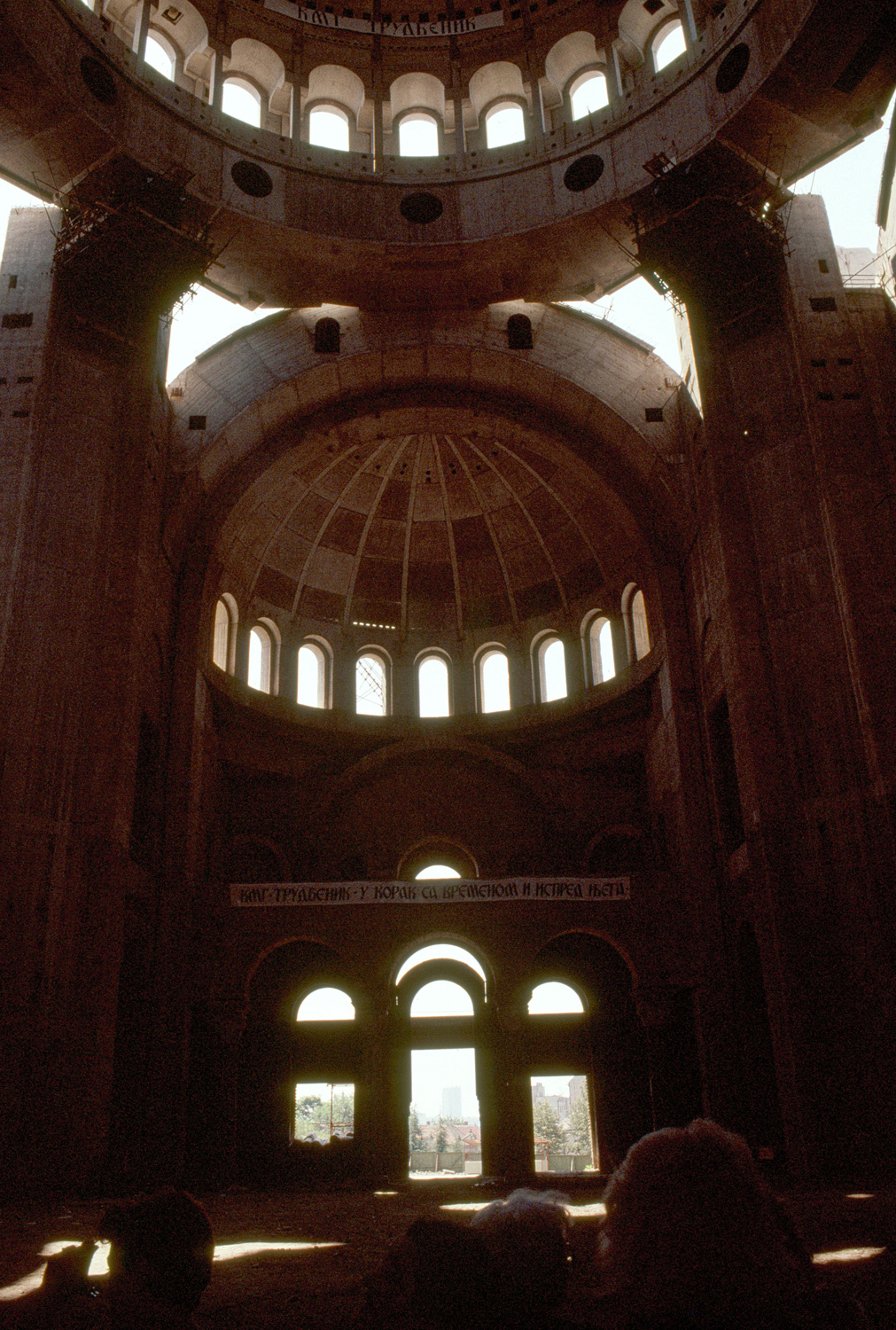 Cathedrals, Churches, Domes, Greek cross-plan, Religious buildings, Serbia --History, Sava, Saint, Piers (supporting elements), Unfinished architecture, Clerestories, Braces (Supporting elements), Semidomes, Unfinished, Arched windows, Construction sites