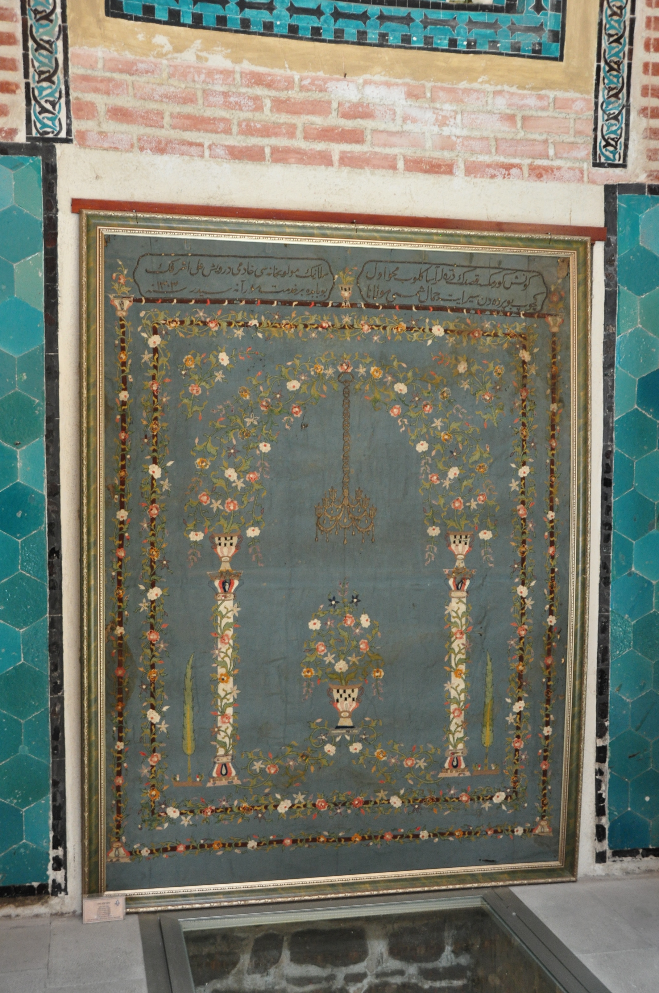 interior, floral wall hanging or painting in the tomb above glass covered opening in floor, July 2010