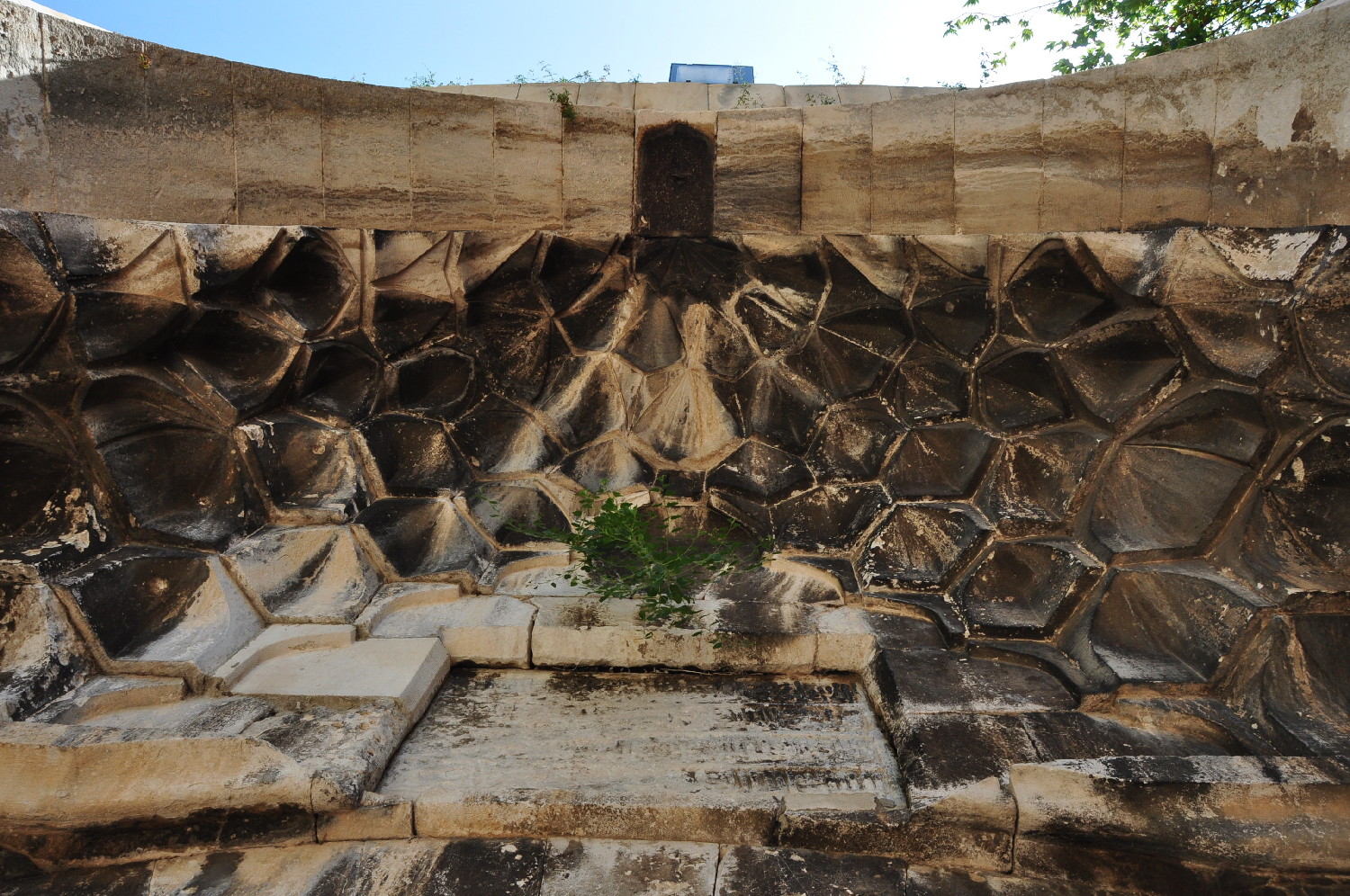 exterior, view up below at portal arch and muqarnas semidome, July 2010