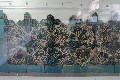 close-up view, glass protected wall with cross and eight-pointed star shaped tiles with patterns, arabesques and animals on them, July 2010