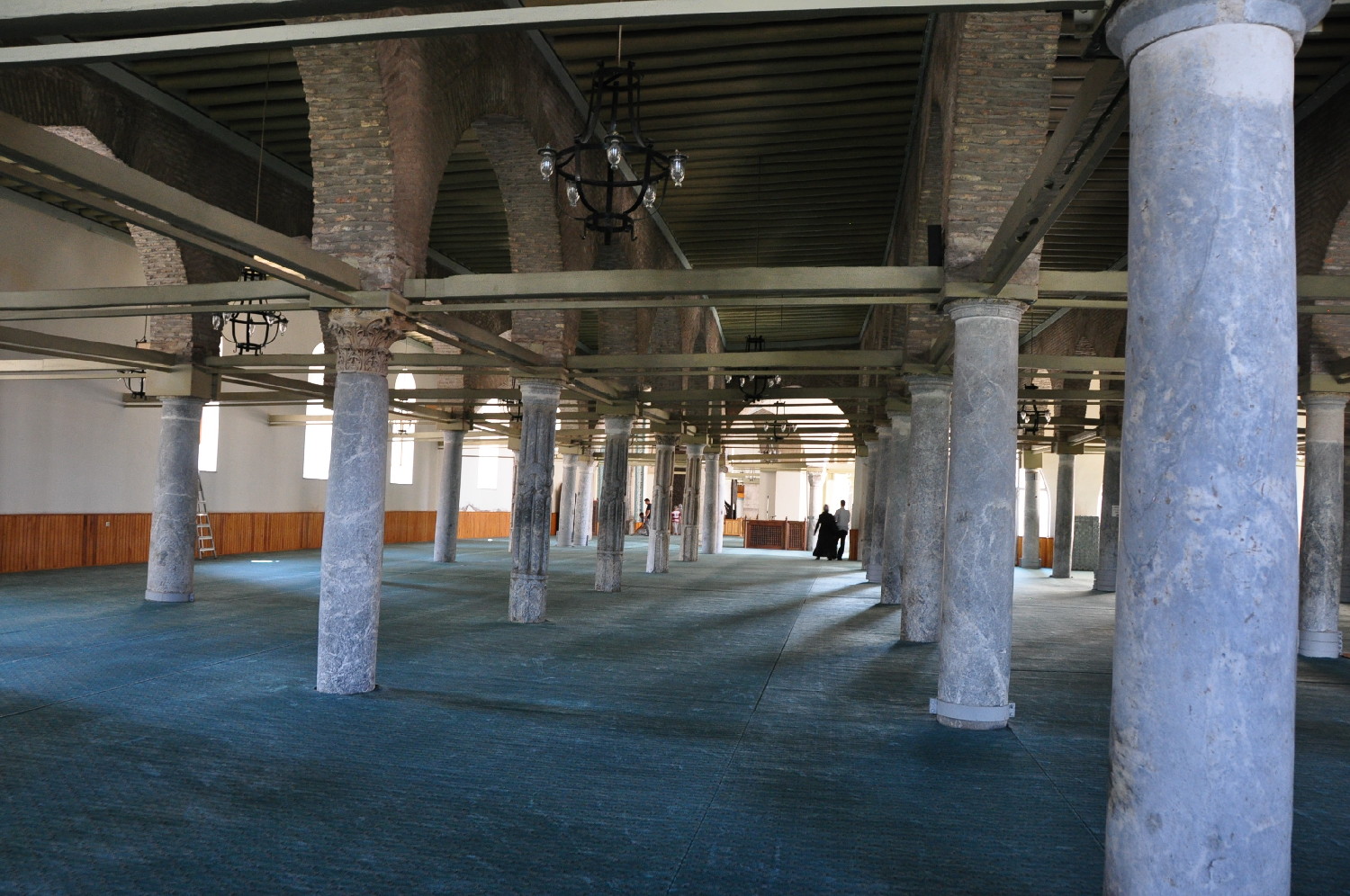 interior, lengthwise view of prayer hall with mihrab and minbar in distance, July 2010