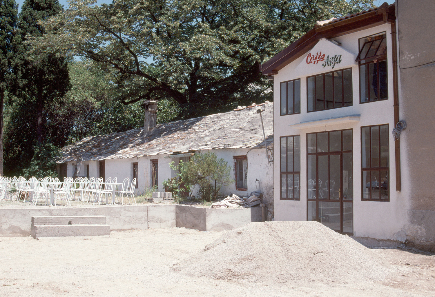 exterior, project site for new pedestrian street, off of Onescukova street, with existing cafe, 1990