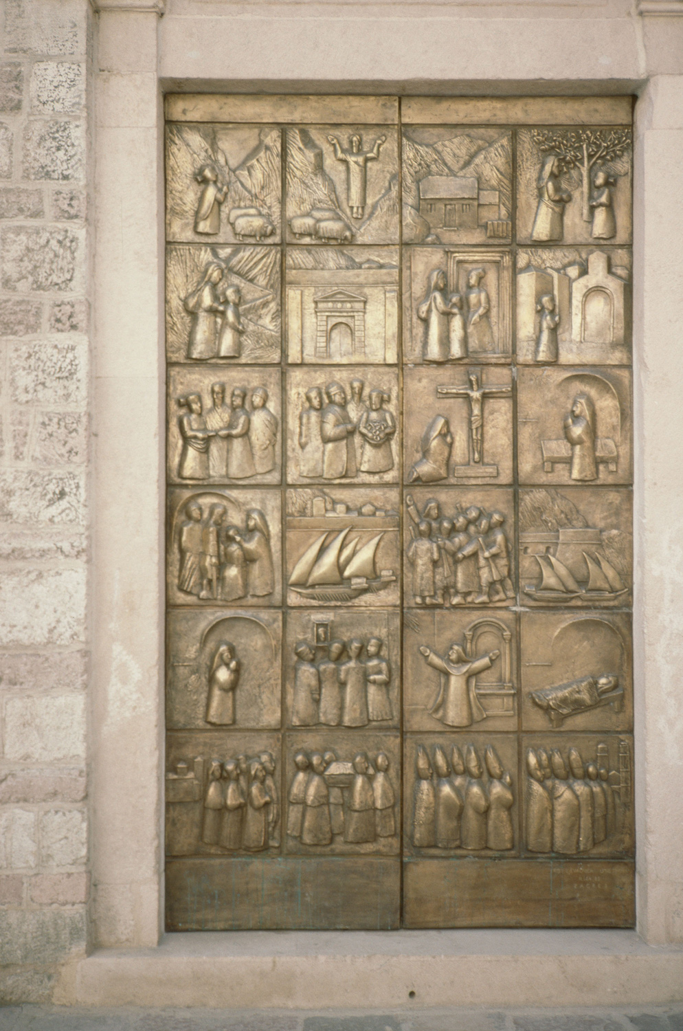 exterior, bronze doors with reliefs depicting the story of Kotor's patron saint, the Blessed Ozana, 1989
