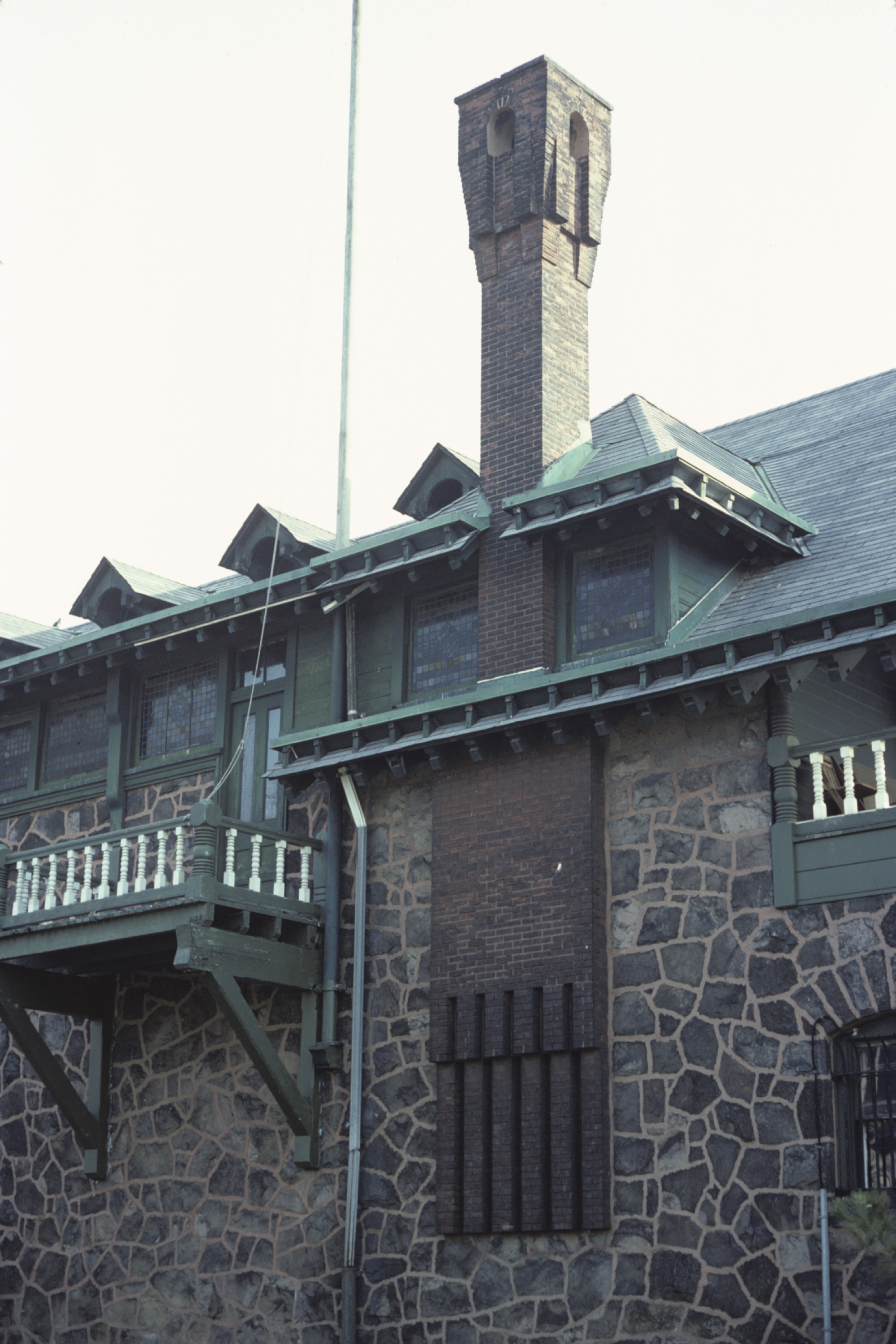 13 Boathouse Row, Philadelphia, PA 19130-1002 exterior, brick chimney in stone wall, with wooden balconies, 1979