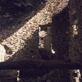 general view, stone infill under rock overhang; walls perpendicular to the cliff face subdivide the abris, 1975
