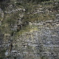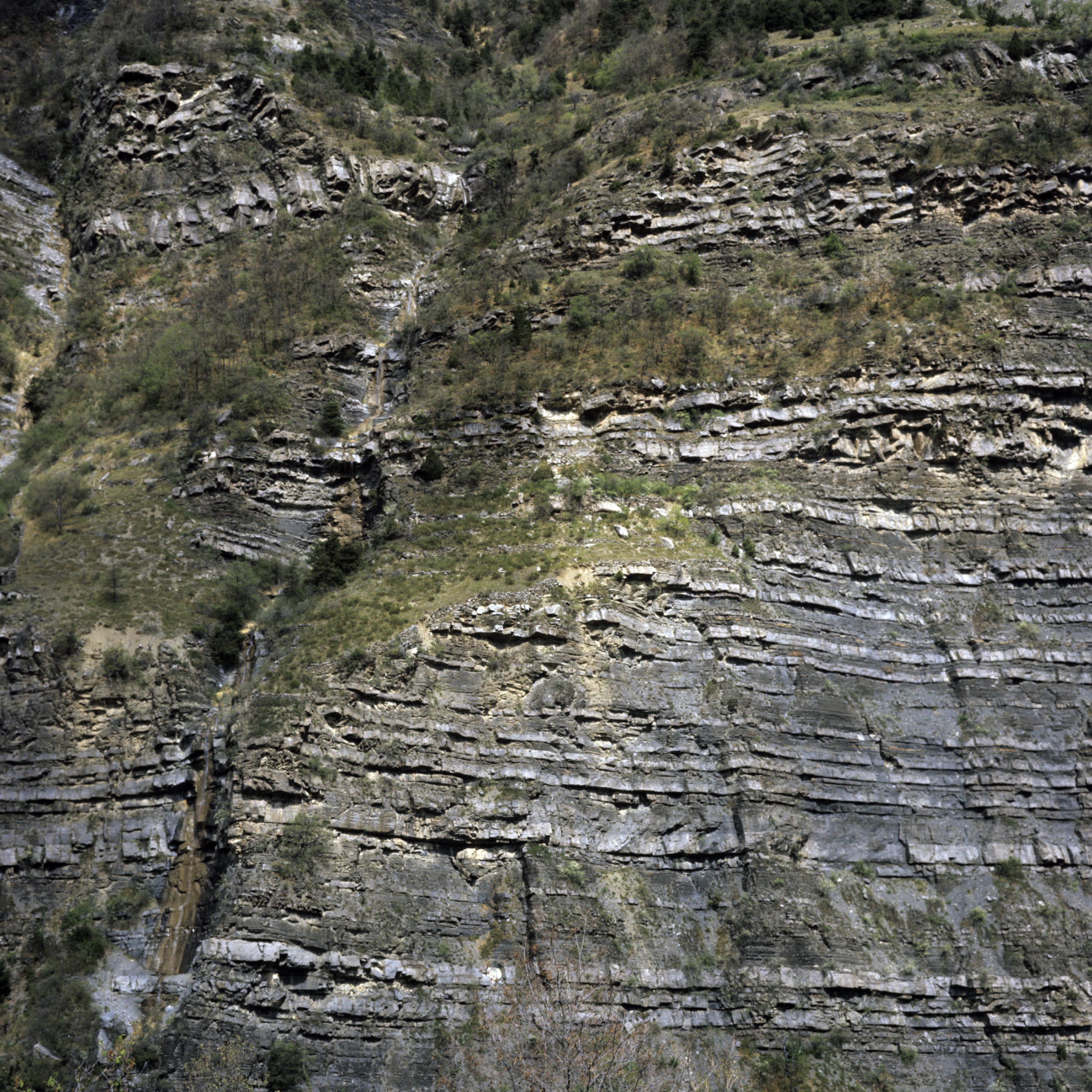 general view, rock strata; demarcations of layered rocks truncated by (approximately) vertical erosion at varying lateral positions, 1975