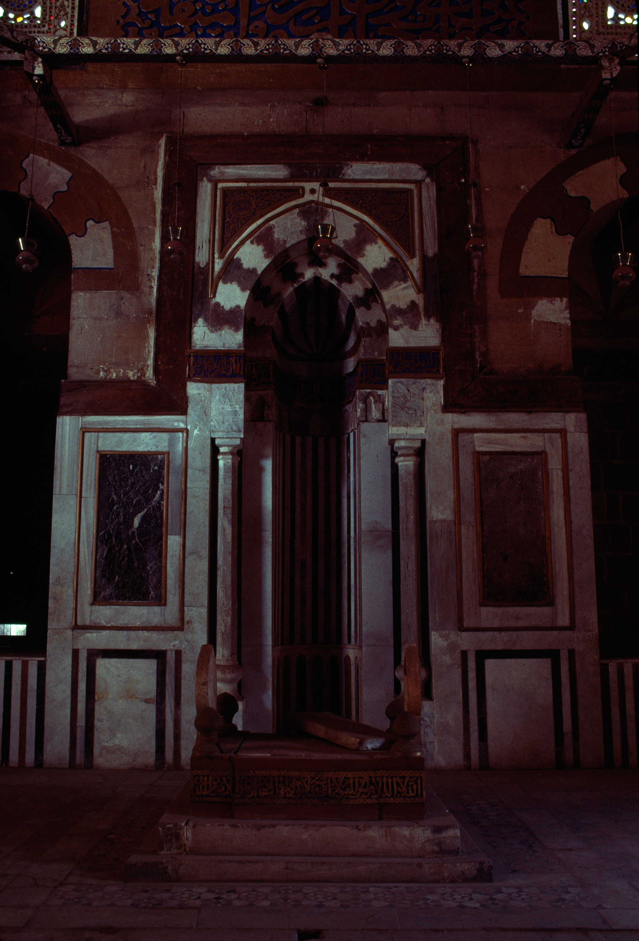 consists of khanqah, large mosque, two mausoleums, two sabil-kuttabs, two minarets, two large domes; central courtyard with four-iwan plan; stone minbar, made by order of Sultan Qayt-Bay in 1483 interior, mihrab in the khanqah's mosque, 1985