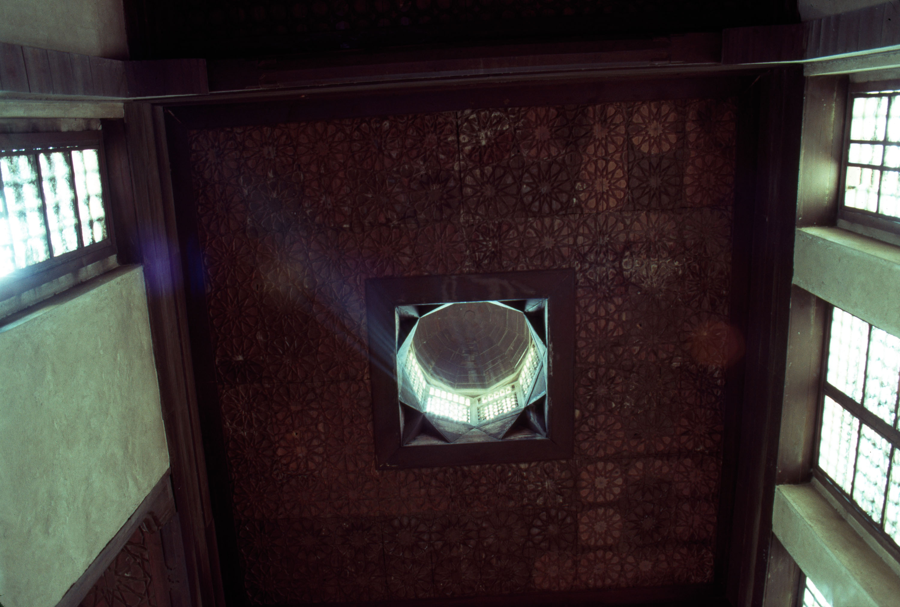 interior, view of ceiling of central hall (durqa'a) in second-story reception hall (qa', 1985
