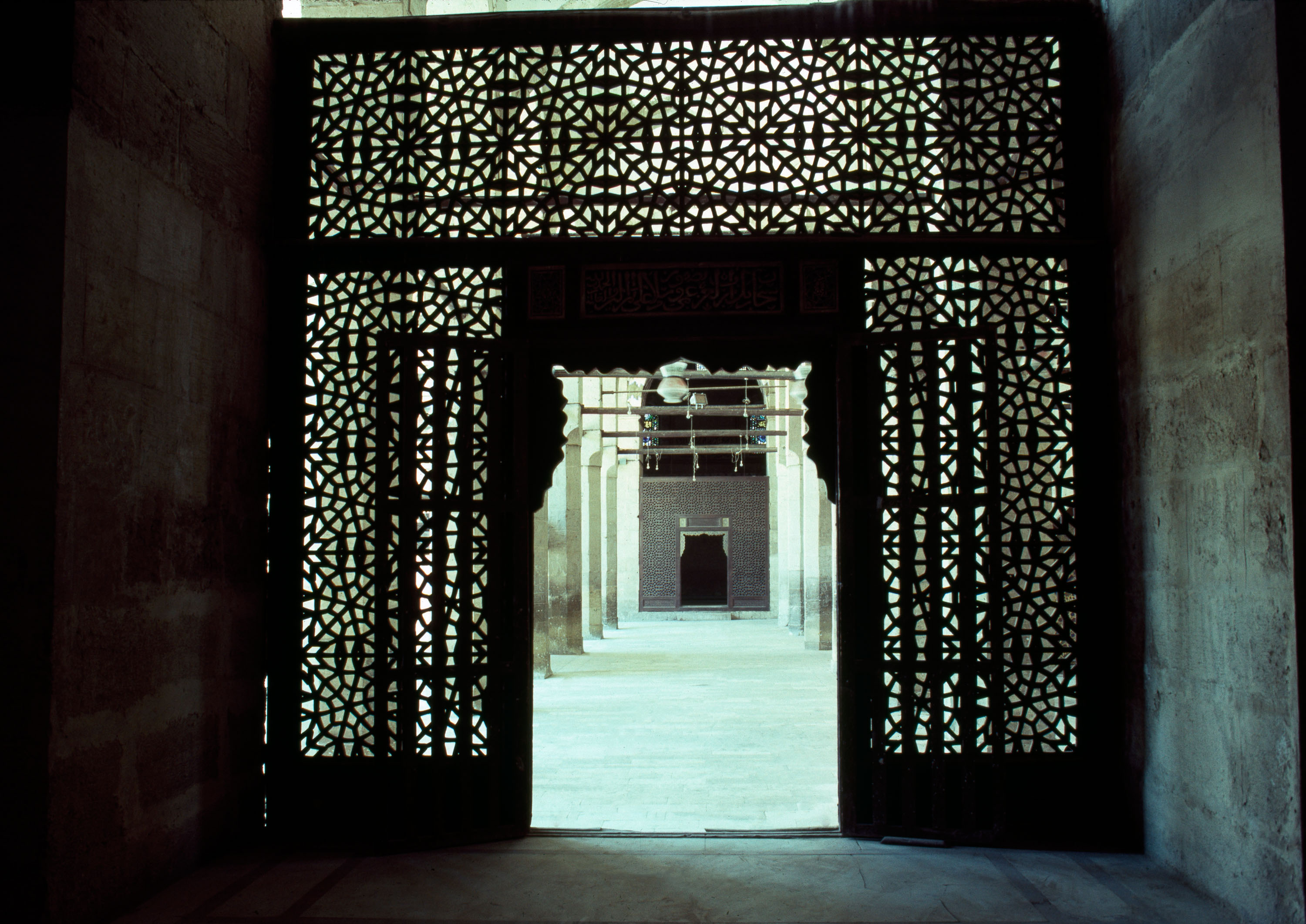 consists of khanqah, large mosque, two mausoleums, two sabil-kuttabs, two minarets, two large domes; central courtyard with four-iwan plan; stone minbar, made by order of Sultan Qayt-Bay in 1483 interior, view of mausoleum door from the inside, 1985
