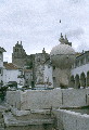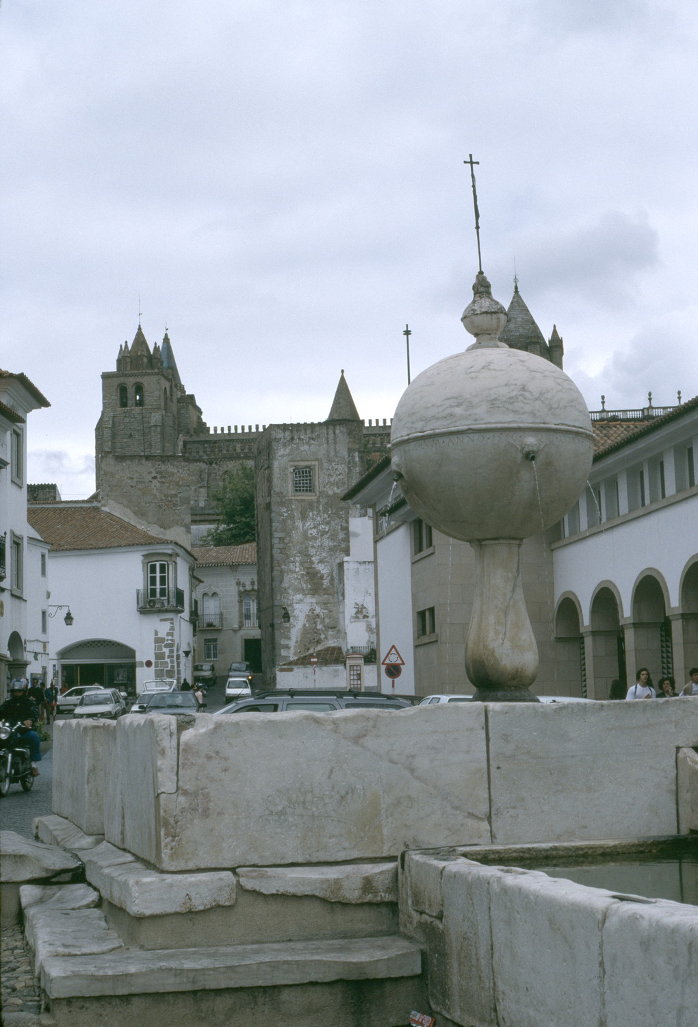general view, view to northwest, Renaissance fountain, Largo das Portas de Moura, with Moorish gate and Cathedral of Évora tower in distance, 1992