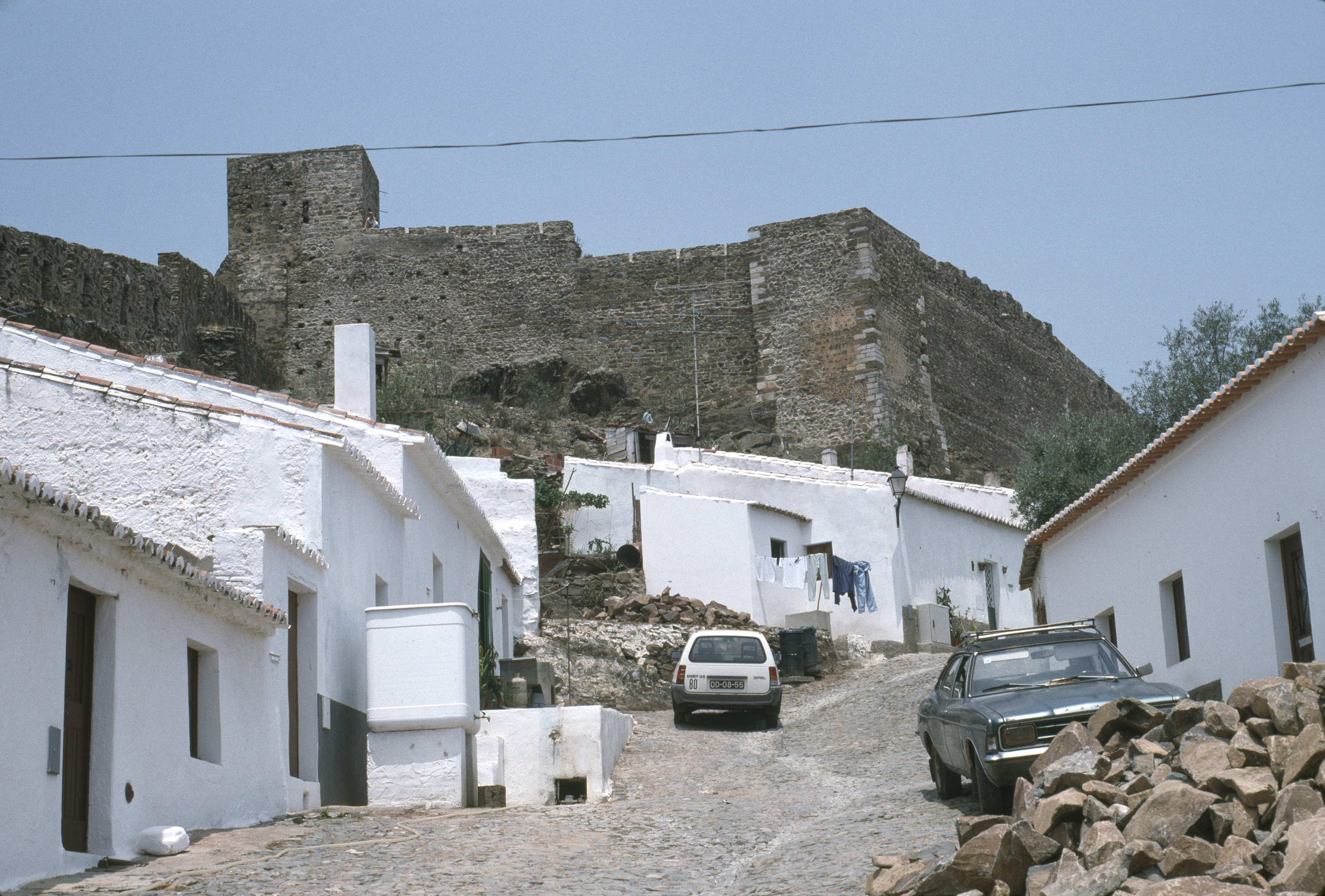 Castles, Fortifications, Keeps, Towers (Building divisions), Architecture, Islamic, Mudejar, Architecture, Medieval, Castles -- Portugal, Automobiles, Rocks, Cobble, Whitewash, Clotheslines, Hill towns, Streetscapes, Residential districts, Stone walls