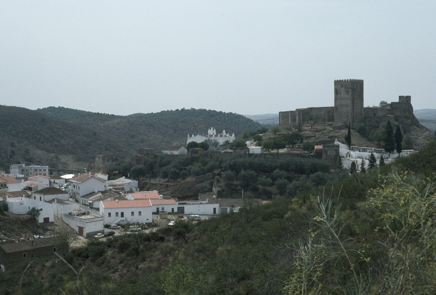 general view, view to south, from up on hill north of old Mértola and castle (is lower left part of panorama with image 163711), 1992