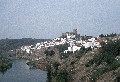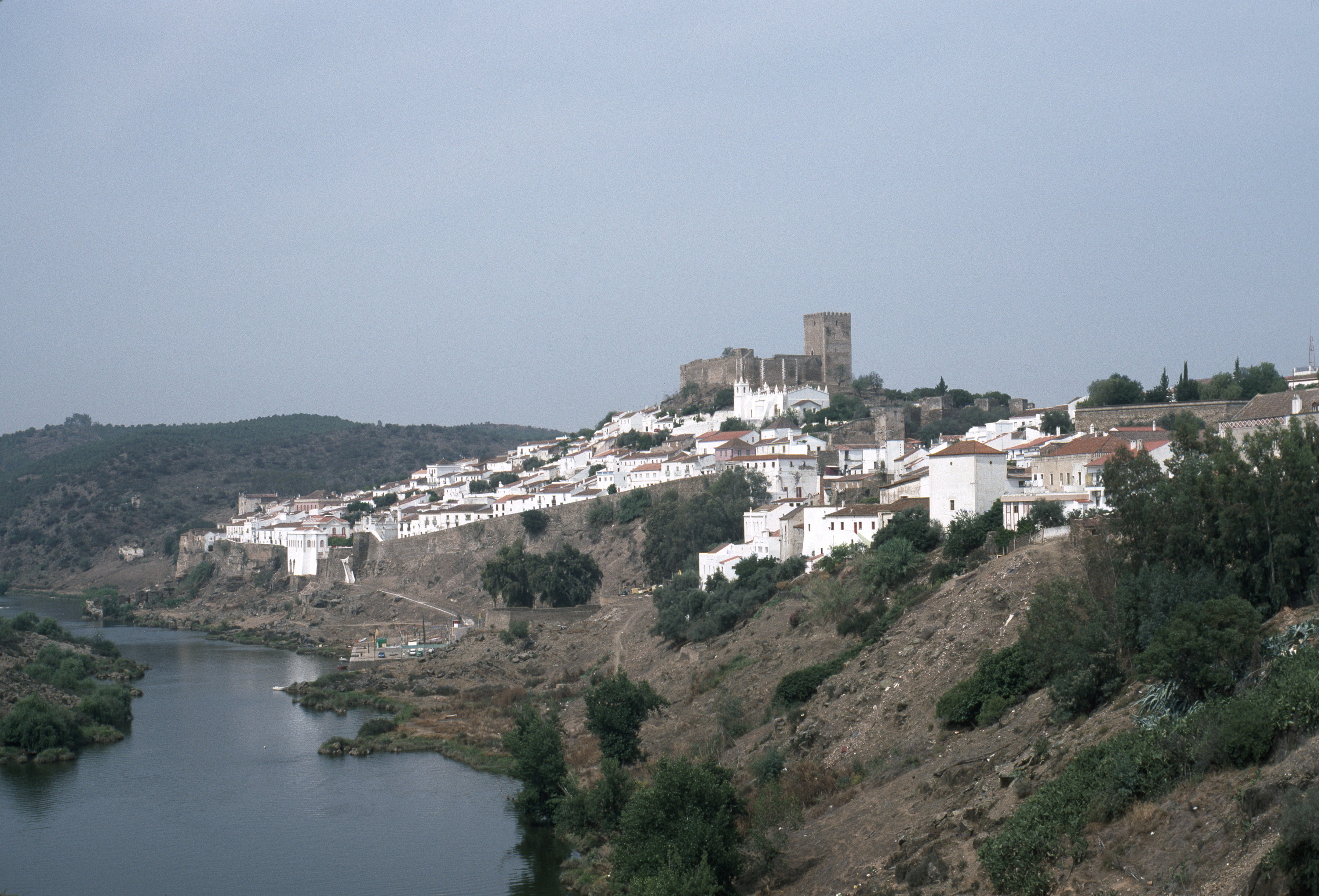 distant view, view from up river, wide view of Mertola surrounded by city walls, castle and other signature buildings visible, 1992