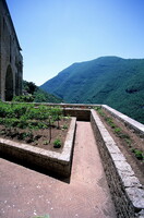 View of the Roseto (Rose Garden) on a lower terrace; Located at Subiaco in the Lazio region south of Rome the Abbey of St. Benedict was constructed in the thirteenth century on top of the grotto (Sacro Speco) where St. Benedict (ca. 480-547), the founder of the Western monastic movement, allegedly spent the first three years of his monastic life. Built at 640 metres, the monastery consists of two small churches and a succession of chapels and grottoes that are joined by a series of stairs. With the exception of the grottoes the frescoes were done by a variety of artists over different time periods who, for the most part, are unknown. Saint Francis of Assisi visited the monastery in 1223; there is a portrait of him painted during his lifetime. Sacro Speco is united under a single abbot with the nearby Santa Scholastica monastery. Source: Sacred Destinations Travel Guide [website]; http://www.sacred-destinations.com/ (accessed 7/15/2010)