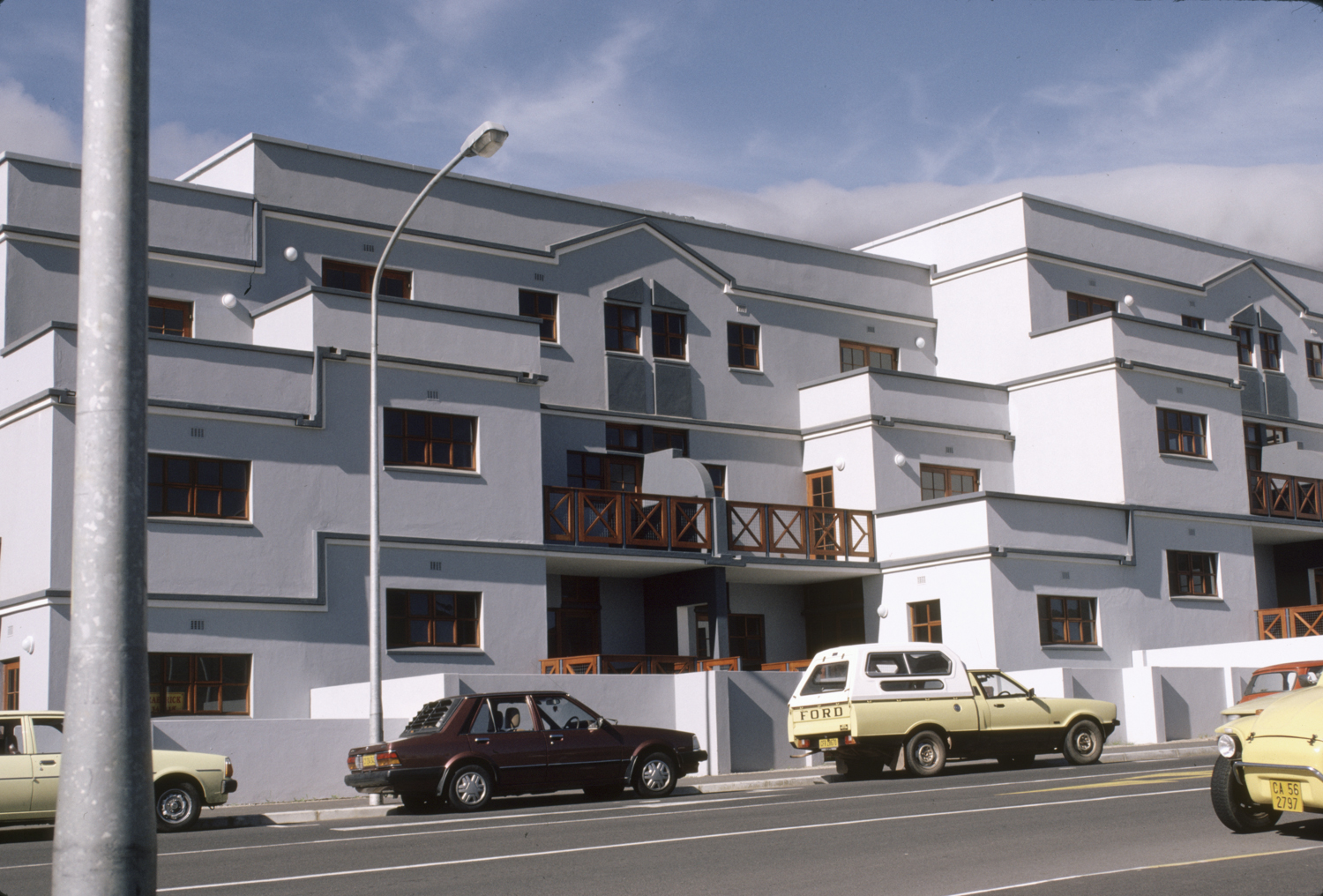 Corner De Villiers & Constitution Street, Zonnebloem, Cape Town, 8001. Built as a 99-unit sectional title flat property (property such as townhouses and flats where an individual owns their own unit in the building) and later converted to the Best Western Cape Suites hotel. exterior, elevation, showing balconies, 1986