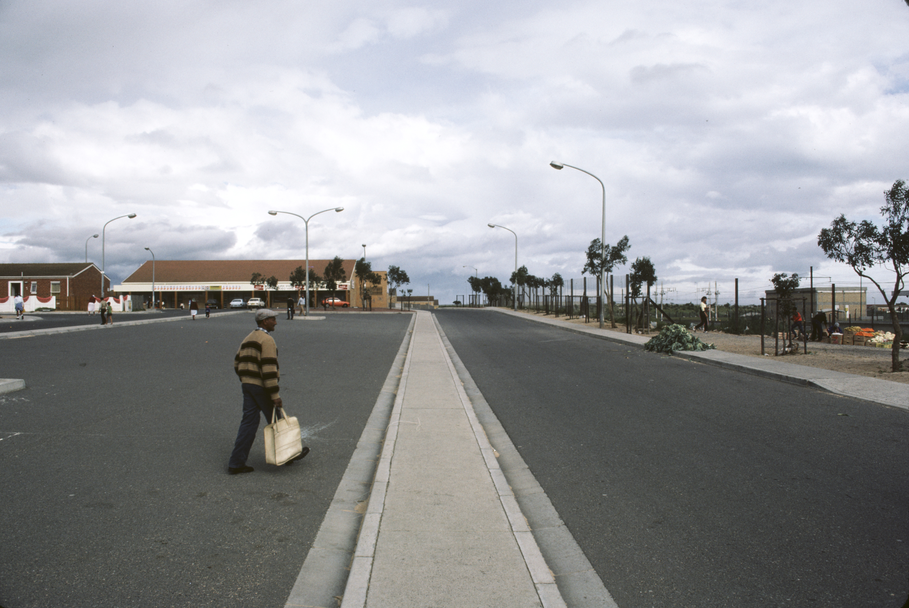 Developed in the 1970s as a coloured area, to provide housing to those removed from their homes by the Group Areas Act. Many families from District Six relocated here when their community was razed. general view, parking area and road with fruit vendor at station in Lentegeur sub-section, 1986